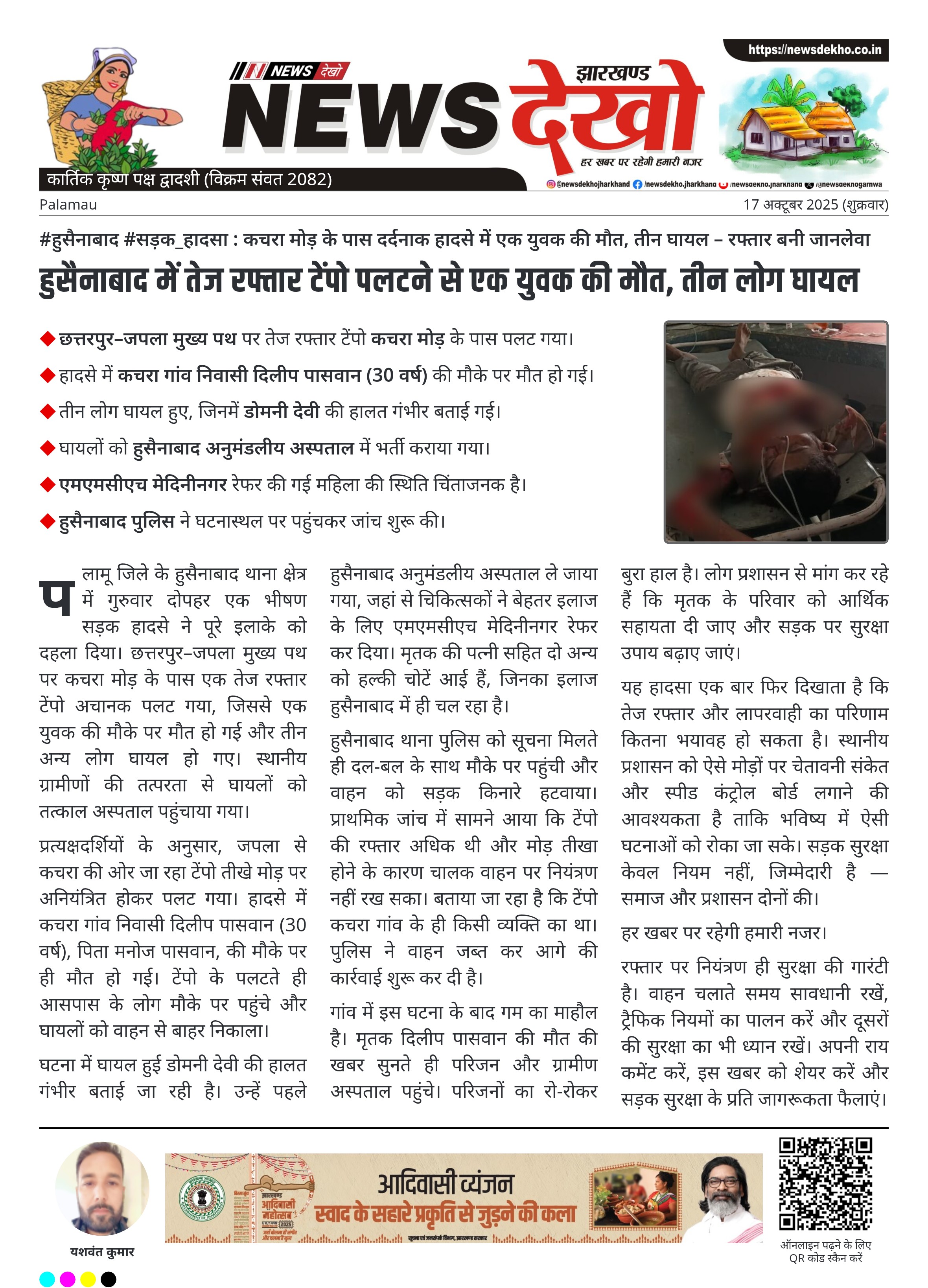 हुसैनाबाद में तेज रफ्तार टेंपो पलटने से एक युवक की मौत, तीन लोग घायल