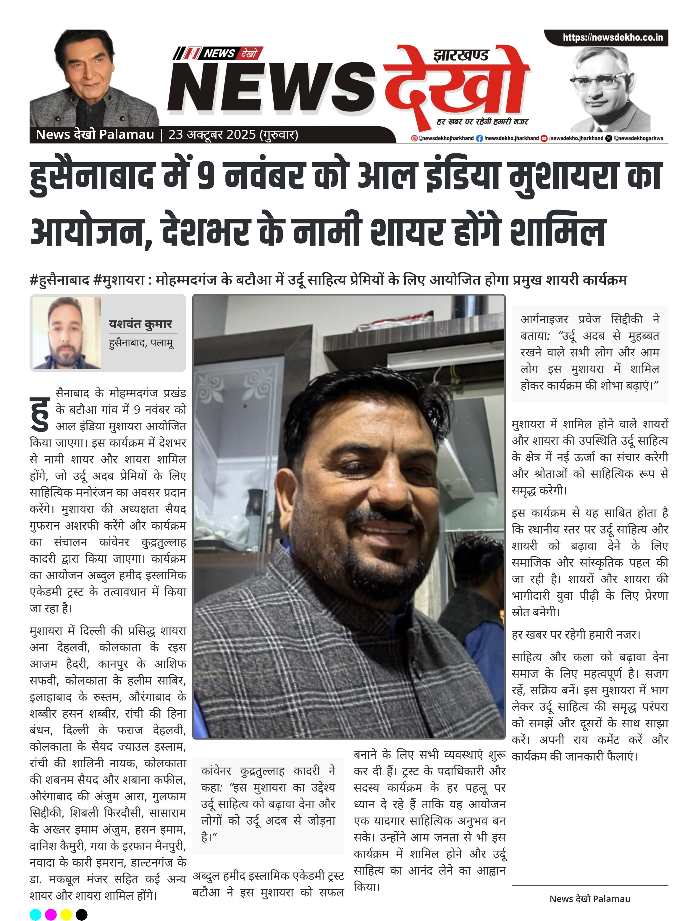 #हुसैनाबाद #मुशायरा : मोहम्मदगंज के बटौआ में उर्दू साहित्य प्रेमियों के लिए आयोजित होगा प्रमुख शायरी कार्यक्रम आल इंडिया मुशायरा 9 नवंबर 2025 को बटौआ गांव, मोहम्मदगंज में आयोजित होगा। मुशायरा की अध्यक्षता सैयद गुफरान अशरफी करेंगे और कांवेनर हैं कुद्रतुल्लाह कादरी। देशभर के दर्जन भर नामी शायर और शायरा कार्यक्रम में हिस्सा लेंगे। दिल्ली की मशहूर शायरा अना देहलवी, कोलकाता के रइस आजम हैदरी, कानपुर के आशिफ सफवी सहित कई प्रतिभागी शामिल होंगे। कार्यक्रम का आयोजन अब्दुल हमीद इस्लामिक…