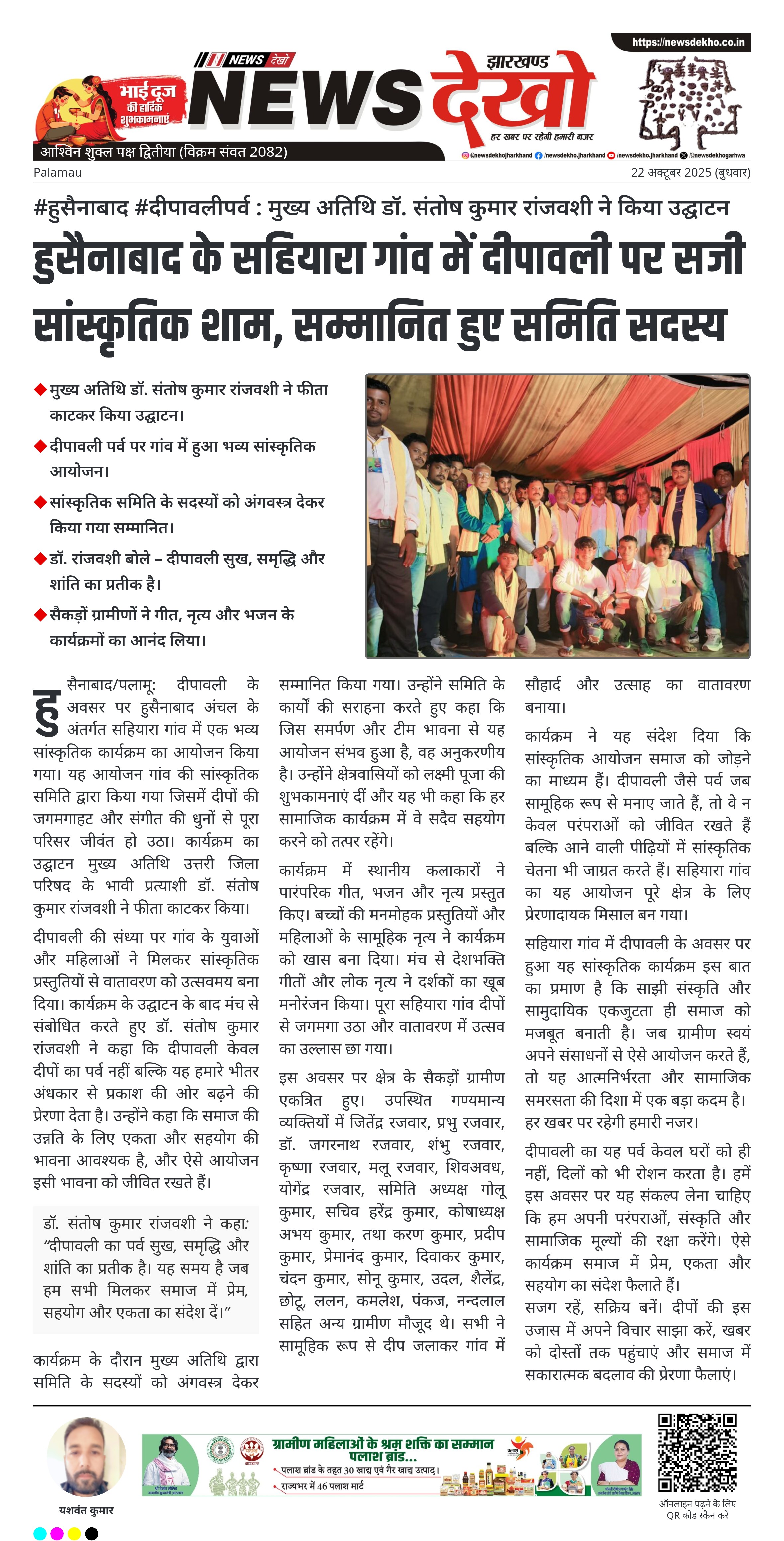 #हुसैनाबाद #दीपावलीपर्व : मुख्य अतिथि डॉ. संतोष कुमार रांजवशी ने किया उद्घाटन मुख्य अतिथि डॉ. संतोष कुमार रांजवशी ने फीता काटकर किया उद्घाटन। दीपावली पर्व पर गांव में हुआ भव्य सांस्कृतिक आयोजन। सांस्कृतिक समिति के सदस्यों को अंगवस्त्र देकर किया गया सम्मानित। डॉ. रांजवशी बोले – दीपावली सुख, समृद्धि और शांति का प्रतीक है। सैकड़ों ग्रामीणों ने गीत, नृत्य और भजन के कार्यक्रमों का आनंद लिया। हुसैनाबाद/पलामू: दीपावली के अवसर पर हुसैनाबाद अंचल के अंतर्गत सहियारा गांव में एक भव्य…