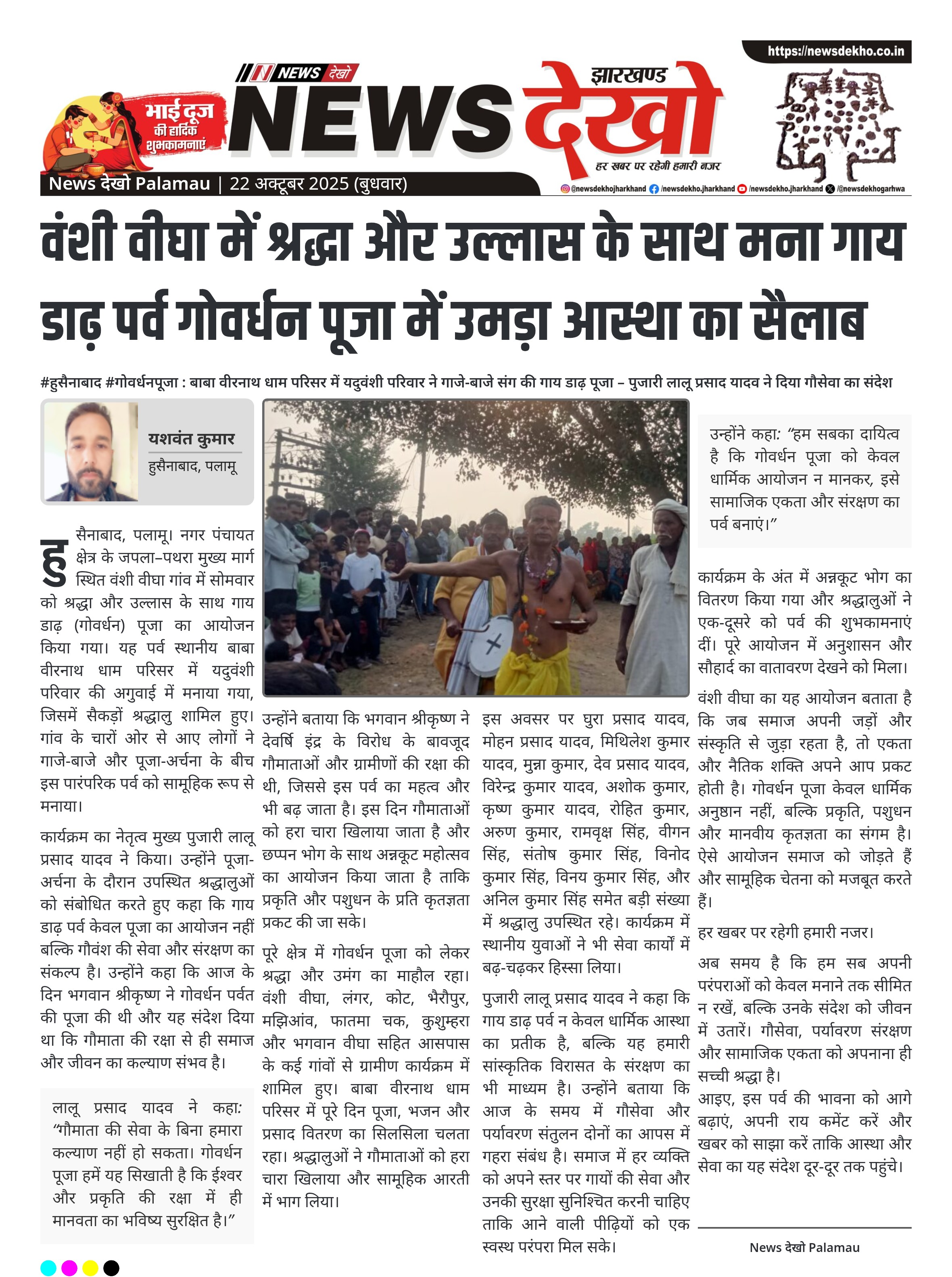 #हुसैनाबाद #गोवर्धनपूजा : बाबा वीरनाथ धाम परिसर में यदुवंशी परिवार ने गाजे-बाजे संग की गाय डाढ़ पूजा – पुजारी लालू प्रसाद यादव ने दिया गौसेवा का संदेश वंशी वीघा गांव में गोवर्धन पूजा श्रद्धा और उत्साह के साथ संपन्न हुई। आयोजन स्थल बाबा वीरनाथ धाम परिसर रहा, जहां सैकड़ों लोग पहुंचे। मुख्य पुजारी लालू प्रसाद यादव ने कहा गौसेवा के बिना जीवन अधूरा है। भगवान श्रीकृष्ण के अन्नकूट महोत्सव और छप्पन भोग का आयोजन किया गया। आसपास के गांवों से…