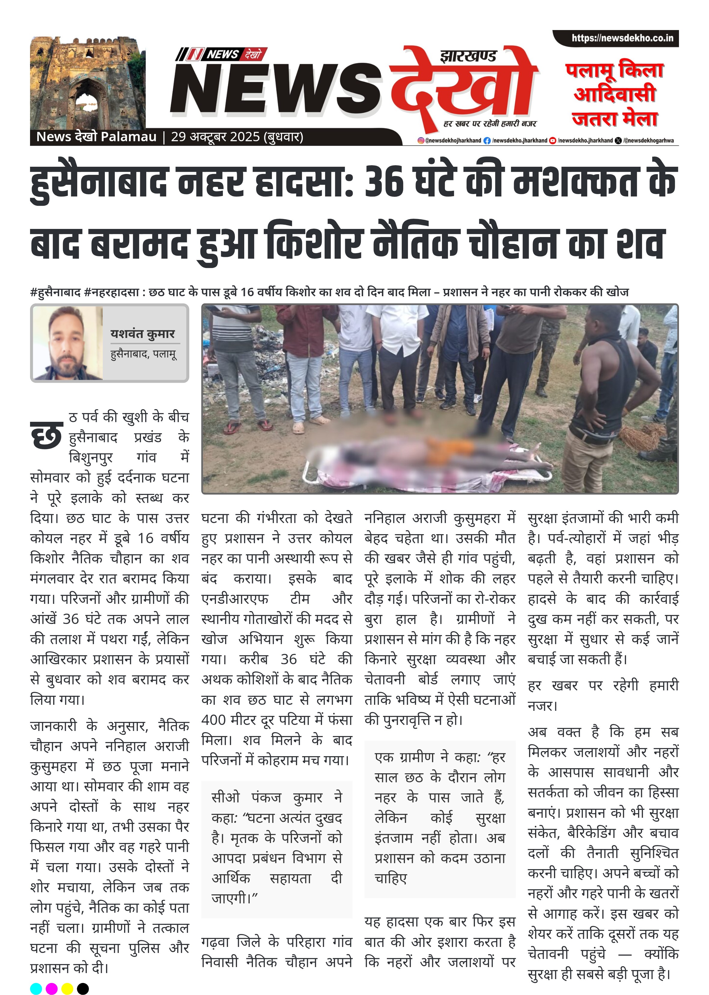 #हुसैनाबाद #नहरहादसा : छठ घाट के पास डूबे 16 वर्षीय किशोर का शव दो दिन बाद मिला – प्रशासन ने नहर का पानी रोककर की खोज हुसैनाबाद के बिशुनपुर गांव के पास नहर में 16 वर्षीय नैतिक चौहान डूब गया था। 36 घंटे की खोजबीन के बाद शव छठ घाट से 400 मीटर दूर पटिया में फंसा मिला। नैतिक गढ़वा जिले के परिहारा गांव निवासी था, ननिहाल अराजी कुसुमहरा आया हुआ था। हादसा पैर फिसलने से हुआ, युवक गहरे पानी…