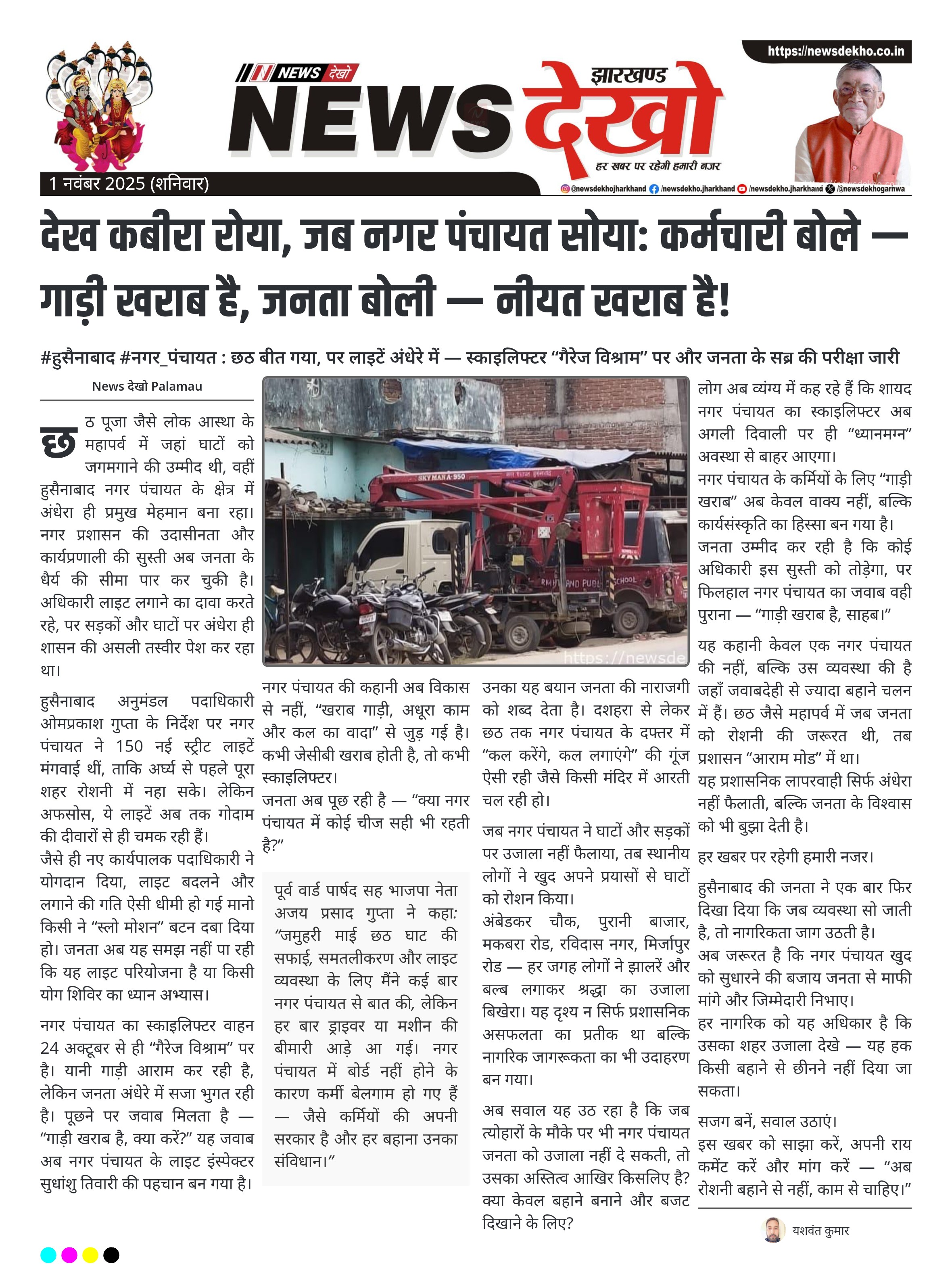 #हुसैनाबाद #नगर_पंचायत : छठ बीत गया, पर लाइटें अंधेरे में — स्काइलिफ्टर “गैरेज विश्राम” पर और जनता के सब्र की परीक्षा जारी हुसैनाबाद नगर पंचायत में 150 नई लाइटें मंगवाई गईं, लेकिन अधिकांश अब तक नहीं लग पाईं। छठ पर्व खत्म हो गया, पर स्काइलिफ्टर वाहन 24 अक्टूबर से ही “गैरेज विश्राम” पर है। कर्मचारी बोले — गाड़ी खराब है, जनता बोली — नीयत खराब है। पूर्व वार्ड पार्षद अजय प्रसाद गुप्ता ने नगर पंचायत पर लापरवाही और मनमानी का…