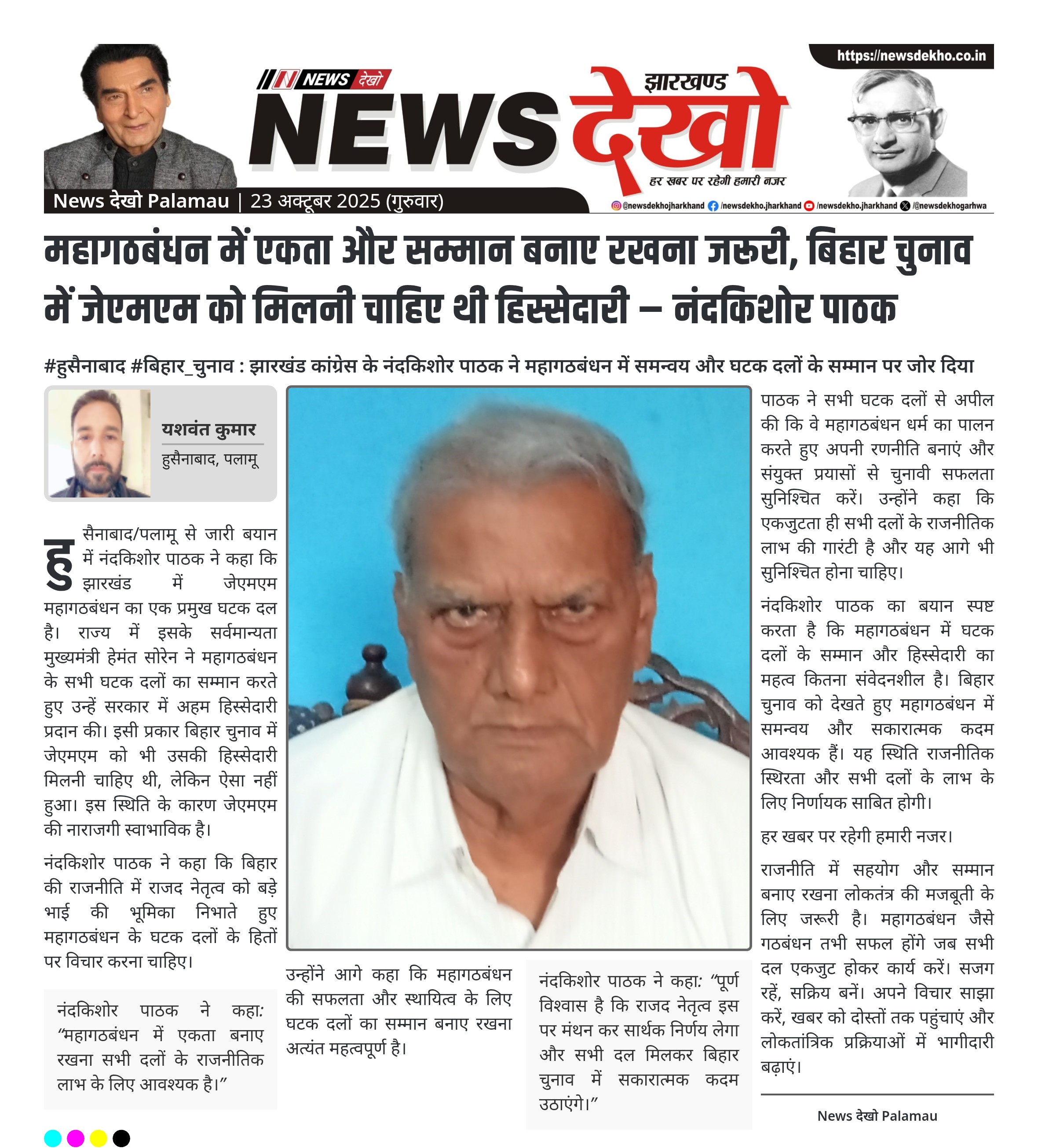 #हुसैनाबाद #बिहार_चुनाव : झारखंड कांग्रेस के नंदकिशोर पाठक ने महागठबंधन में समन्वय और घटक दलों के सम्मान पर जोर दिया नंदकिशोर पाठक, झारखंड प्रदेश कांग्रेस शिक्षा समिति के प्रदेश उपाध्यक्ष और जिला चेयरमैन ने महागठबंधन की एकता पर बल दिया। उन्होंने कहा कि जेएमएम महागठबंधन का एक प्रमुख घटक दल है और इसके सम्मान का ध्यान रखा जाना चाहिए। बिहार चुनाव में जेएमएम को उचित हिस्सेदारी नहीं मिलने से नाराजगी स्वाभाविक है, जिसे राजद नेतृत्व को हल करने की आवश्यकता…