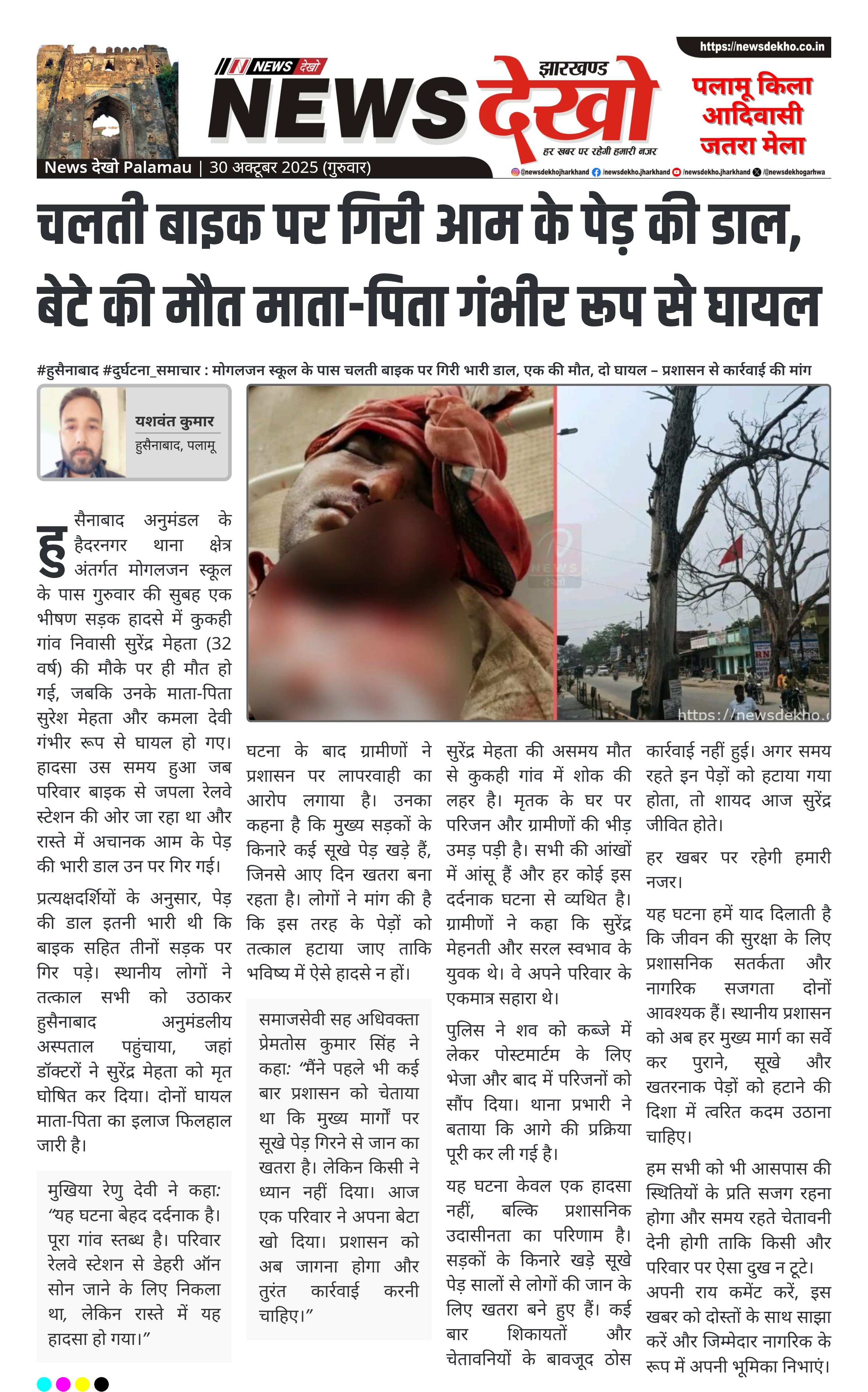 #हुसैनाबाद #दुर्घटना_समाचार : मोगलजन स्कूल के पास चलती बाइक पर गिरी भारी डाल, एक की मौत, दो घायल – प्रशासन से कार्रवाई की मांग हैदरनगर थाना क्षेत्र के मोगलजन स्कूल के पास हुआ दर्दनाक हादसा। कुकही गांव से जपला रेलवे स्टेशन जा रहे परिवार पर आम के पेड़ की डाल गिरी। 32 वर्षीय सुरेंद्र मेहता की मौके पर ही मौत, सुरेश मेहता और कमला देवी घायल। मुखिया रेणु देवी और समाजसेवी प्रेमतोस कुमार सिंह ने जताई गहरी संवेदना। सड़क किनारे…