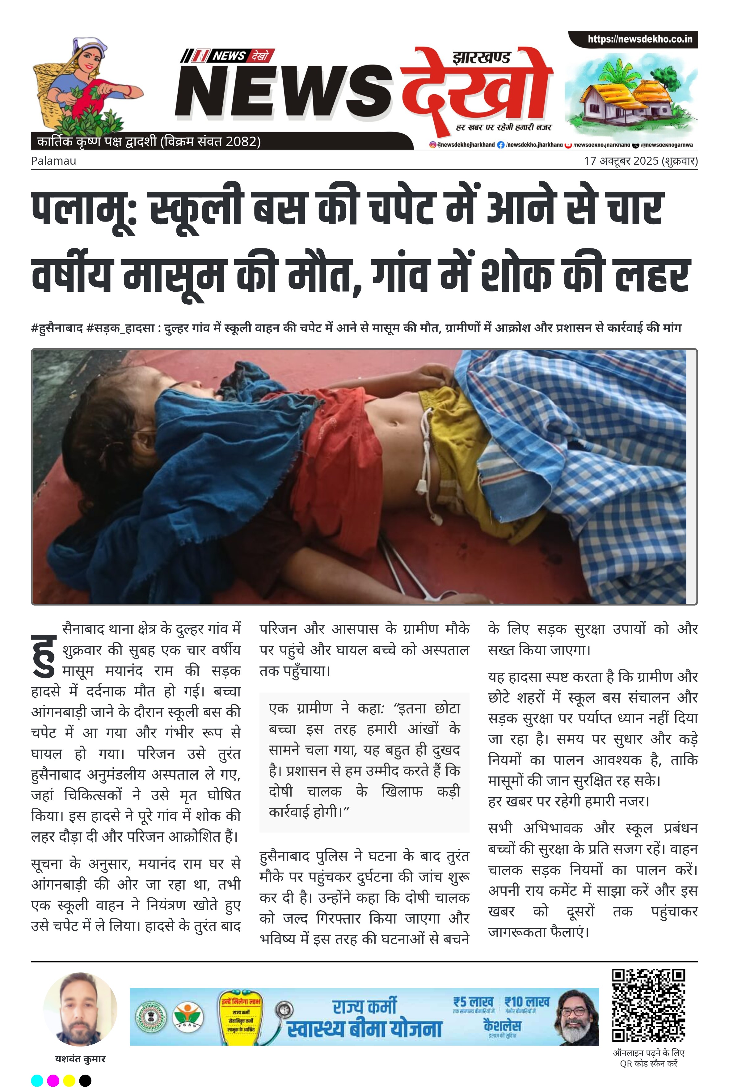 #हुसैनाबाद #सड़क_हादसा : दुल्हर गांव में स्कूली वाहन की चपेट में आने से मासूम की मौत, ग्रामीणों में आक्रोश और प्रशासन से कार्रवाई की मांग दुल्हर गांव में शुक्रवार सुबह 4 वर्षीय मयानंद राम की स्कूली बस की चपेट में आने से मृत्यु हो गई। हादसा सुबह करीब 8:15 बजे हुआ, जब बच्चा आंगनबाड़ी जाने के दौरान सड़क पार कर रहा था। घायल मासूम को तुरंत हुसैनाबाद अनुमंडलीय अस्पताल ले जाया गया, जहां उसे मृत घोषित किया गया। घटना से…