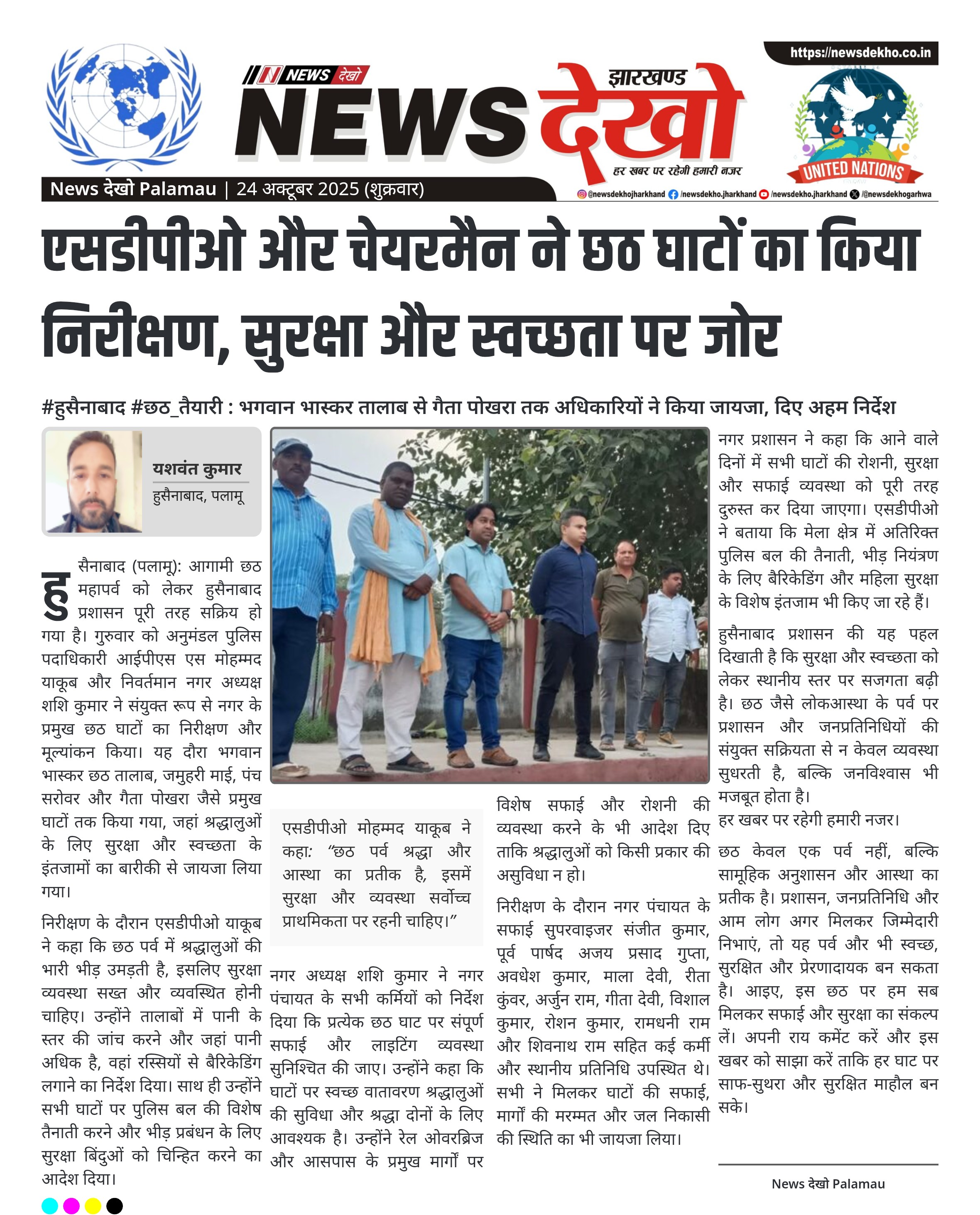 #हुसैनाबाद #छठ_तैयारी : भगवान भास्कर तालाब से गैता पोखरा तक अधिकारियों ने किया जायजा, दिए अहम निर्देश एसडीपीओ मोहम्मद याकूब और नगर अध्यक्ष शशि कुमार ने किया निरीक्षण। सभी प्रमुख छठ घाटों की सुरक्षा और सफाई की व्यवस्था की समीक्षा। पानी में बैरिकेडिंग और विशेष पुलिस तैनाती का निर्देश। नगर पंचायत कर्मियों को सफाई और प्रकाश व्यवस्था दुरुस्त करने के आदेश। पूर्व पार्षदों और स्थानीय कर्मचारियों की उपस्थिति में हुई कार्रवाई। हुसैनाबाद (पलामू): आगामी छठ महापर्व को लेकर हुसैनाबाद प्रशासन…