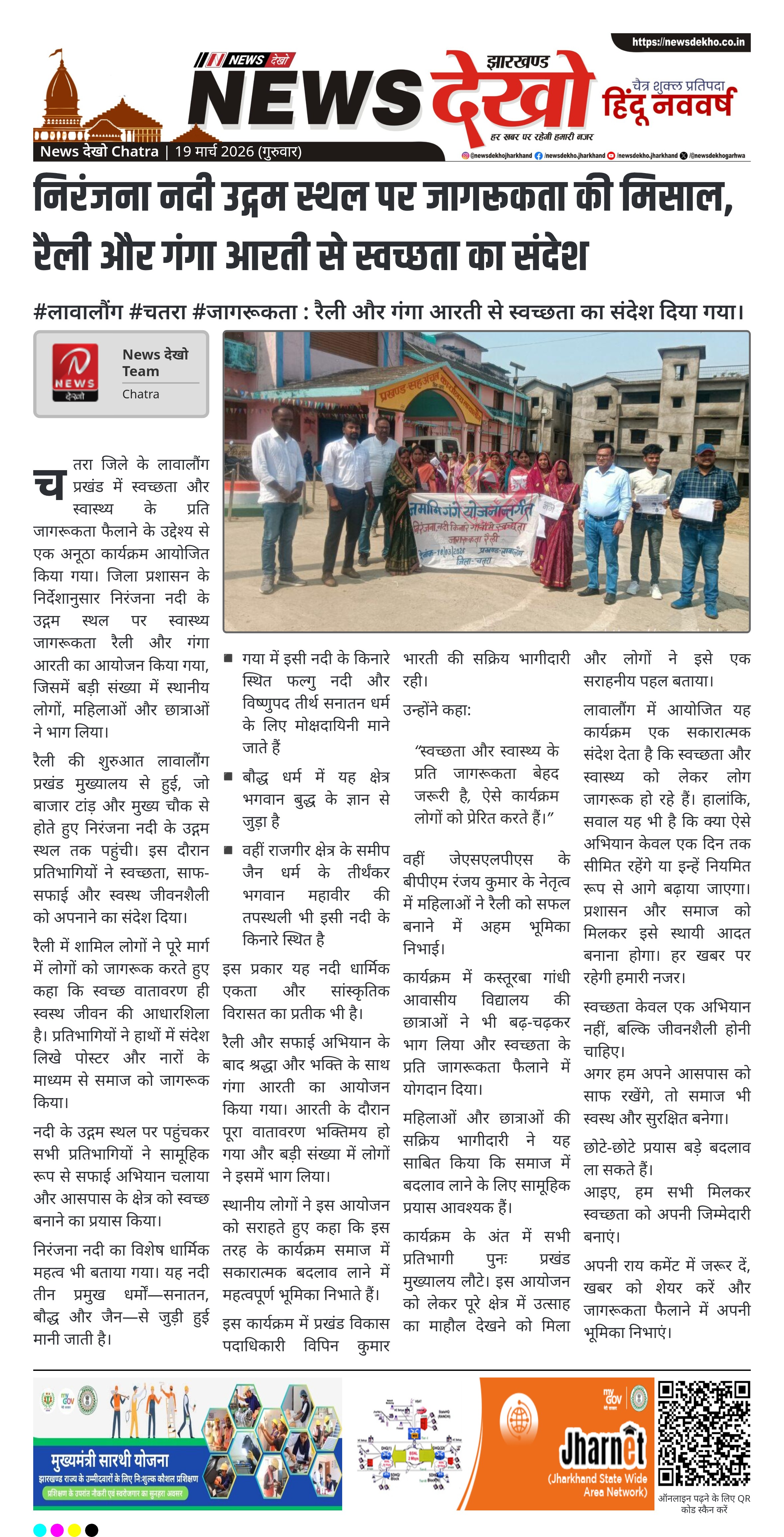 चतरा जिले के लावालौंग प्रखंड में स्वच्छता और स्वास्थ्य के प्रति जागरूकता फैलाने के उद्देश्य से एक अनूठा कार्यक्रम आयोजित किया गया। जिला प्रशासन के निर्देशानुसार निरंजना नदी के उद्गम स्थल पर स्वास्थ्य जागरूकता रैली और गंगा आरती का आयोजन किया गया, जिसमें बड़ी संख्या में स्थानीय लोगों, महिलाओं और छात्राओं ने भाग लिया।