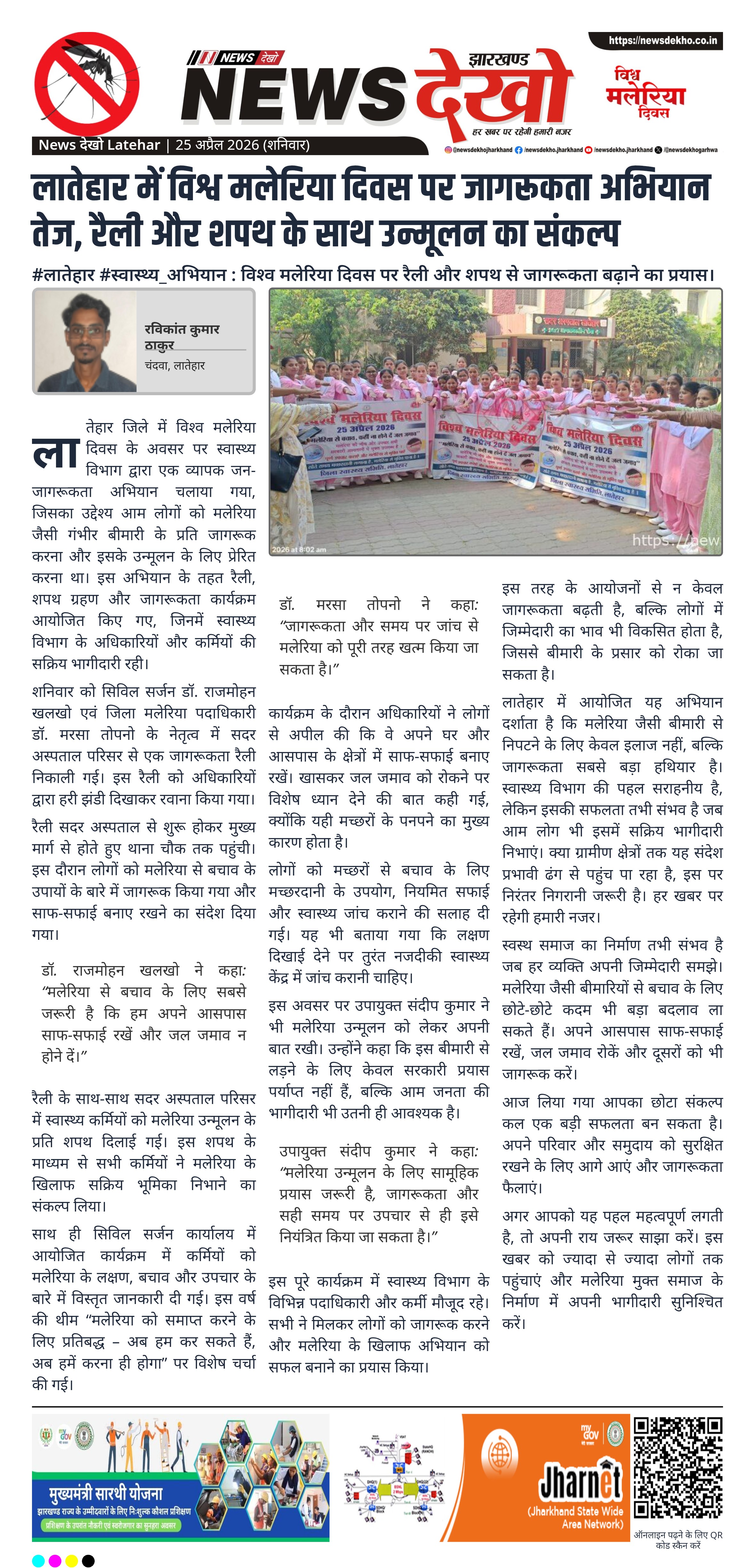 - लातेहार में विश्व मलेरिया दिवस पर जागरूकता अभियान आयोजित।