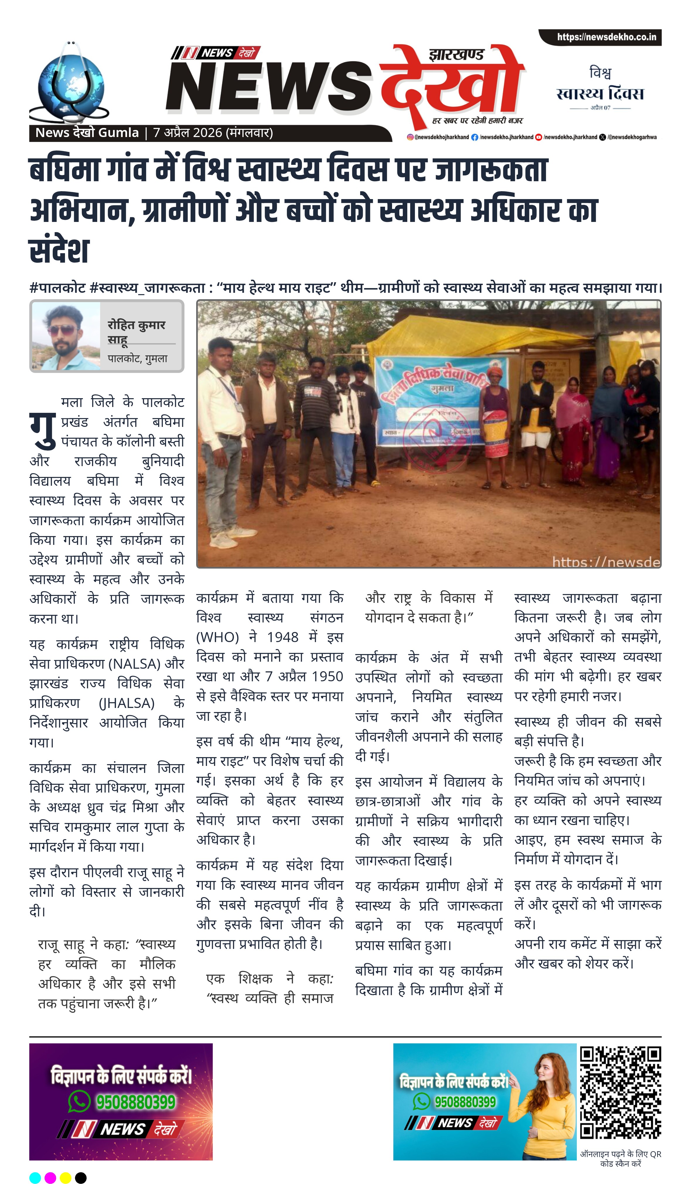 गुमला के पालकोट प्रखंड के बघिमा गांव में विश्व स्वास्थ्य दिवस पर जागरूकता कार्यक्रम आयोजित किया गया। इसमें ग्रामीणों और बच्चों को स्वास्थ्य के महत्व और अधिकारों की जानकारी दी गई। कार्यक्रम विधिक सेवा प्राधिकरण के निर्देशन में हुआ। लोगों को स्वच्छता और नियमित जांच की सलाह दी गई।