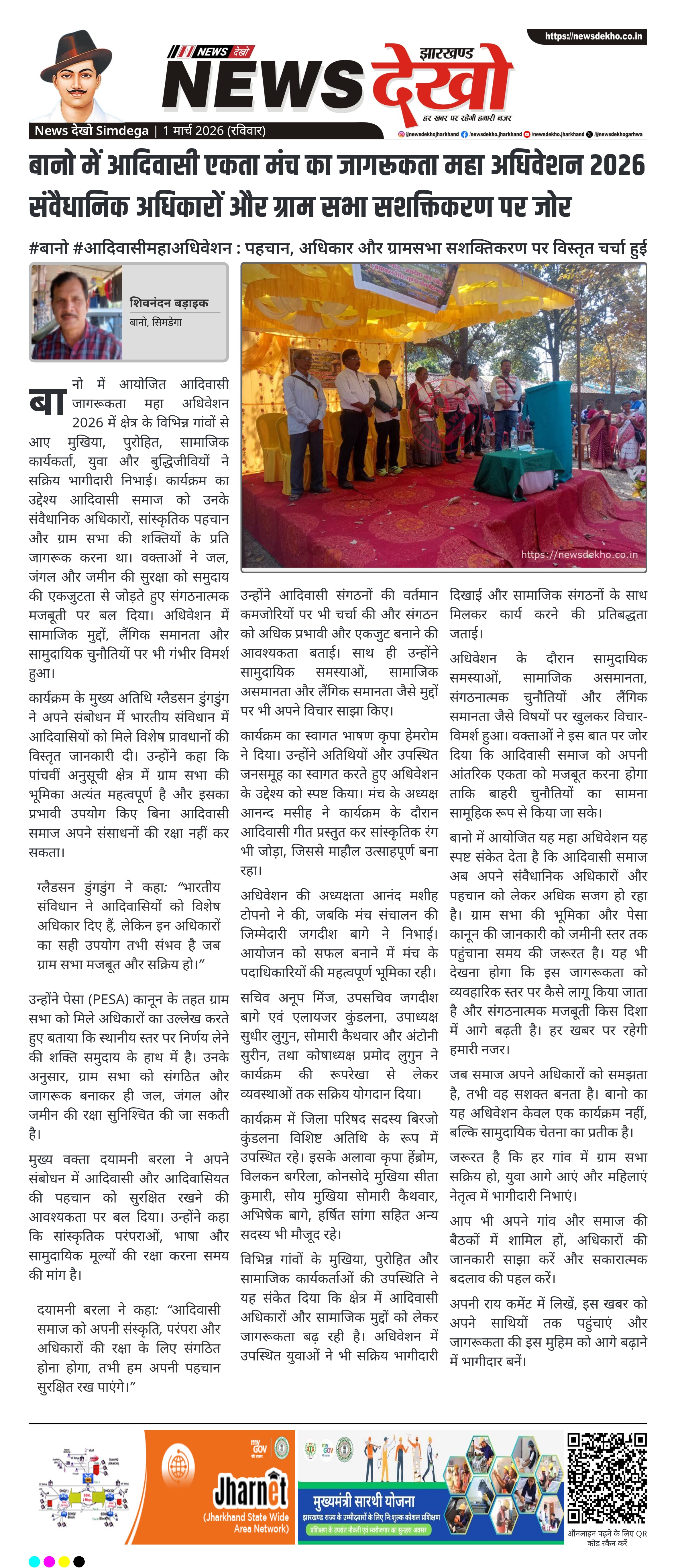 बानो में आयोजित आदिवासी जागरूकता महा अधिवेशन 2026 में क्षेत्र के विभिन्न गांवों से आए मुखिया, पुरोहित, सामाजिक कार्यकर्ता, युवा और बुद्धिजीवियों ने सक्रिय भागीदारी निभाई। कार्यक्रम का उद्देश्य आदिवासी समाज को उनके संवैधानिक अधिकारों, सांस्कृतिक पहचान और ग्राम सभा की शक्तियों के प्रति जागरूक करना था। वक्ताओं ने जल, जंगल और जमीन की सुरक्षा को समुदाय की एकजुटता से जोड़ते हुए संगठनात्मक मजबूती पर बल दिया। अधिवेशन में सामाजिक मुद्दों, लैंगिक समानता और सामुदायिक चुनौतियों पर भी गंभीर विमर्श हुआ।