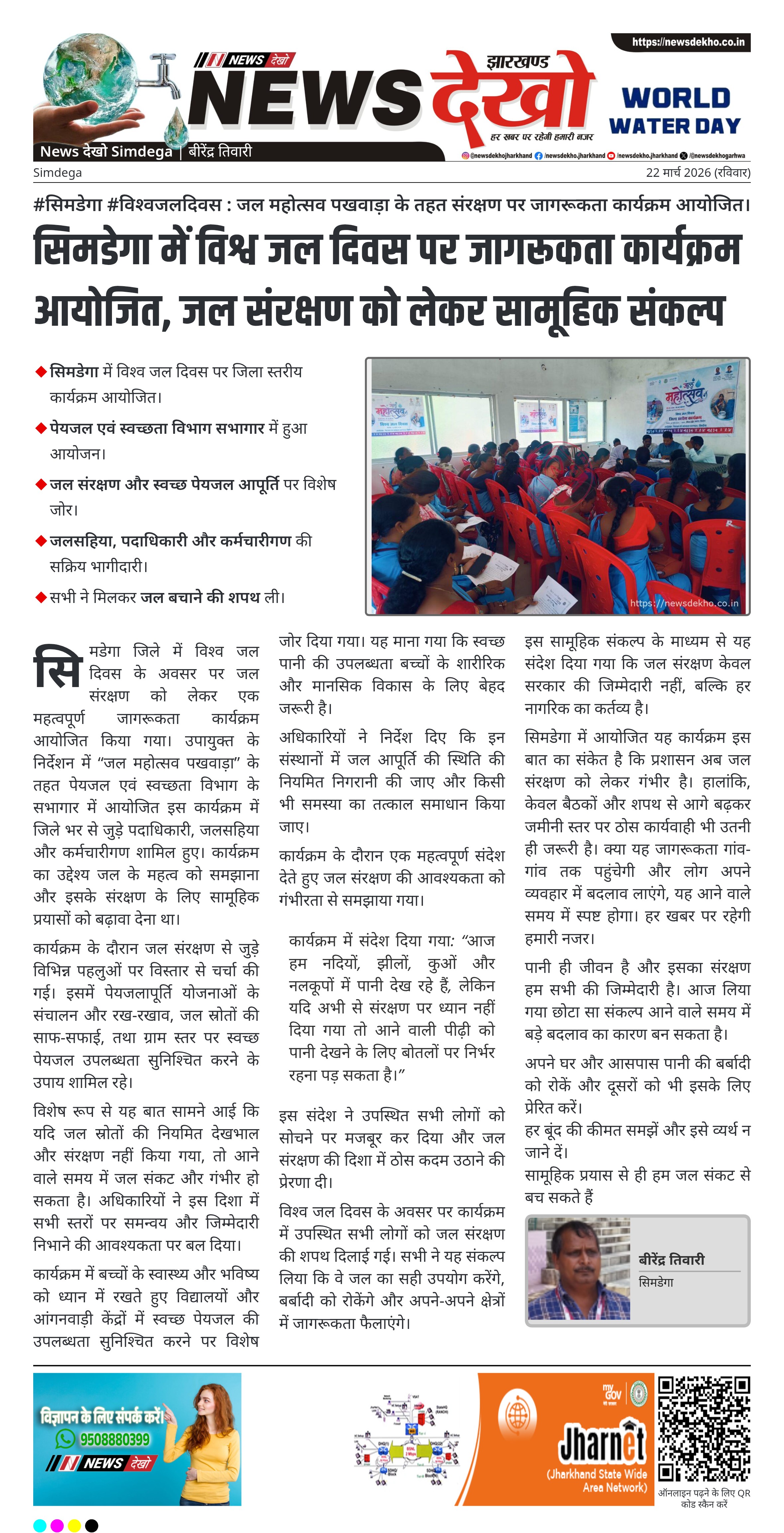 - सिमडेगा में विश्व जल दिवस पर जिला स्तरीय कार्यक्रम आयोजित।