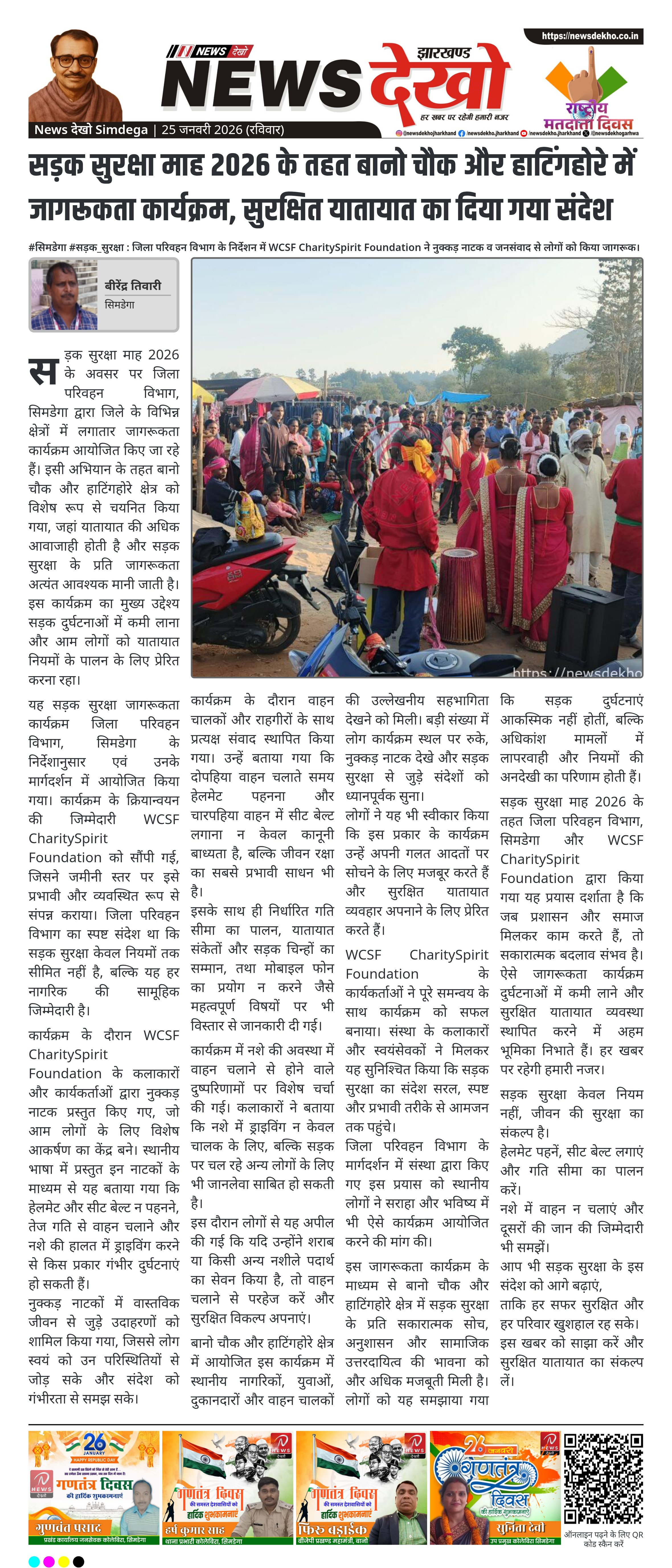 सड़क सुरक्षा माह 2026 के तहत जिला परिवहन विभाग, सिमडेगा और WCSF CharitySpirit Foundation द्वारा किया गया यह प्रयास दर्शाता है कि जब प्रशासन और समाज मिलकर काम करते हैं, तो सकारात्मक बदलाव संभव है। ऐसे जागरूकता कार्यक्रम दुर्घटनाओं में कमी लाने और सुरक्षित यातायात व्यवस्था स्थापित करने में अहम भूमिका निभाते हैं। हर खबर पर रहेगी हमारी नजर।