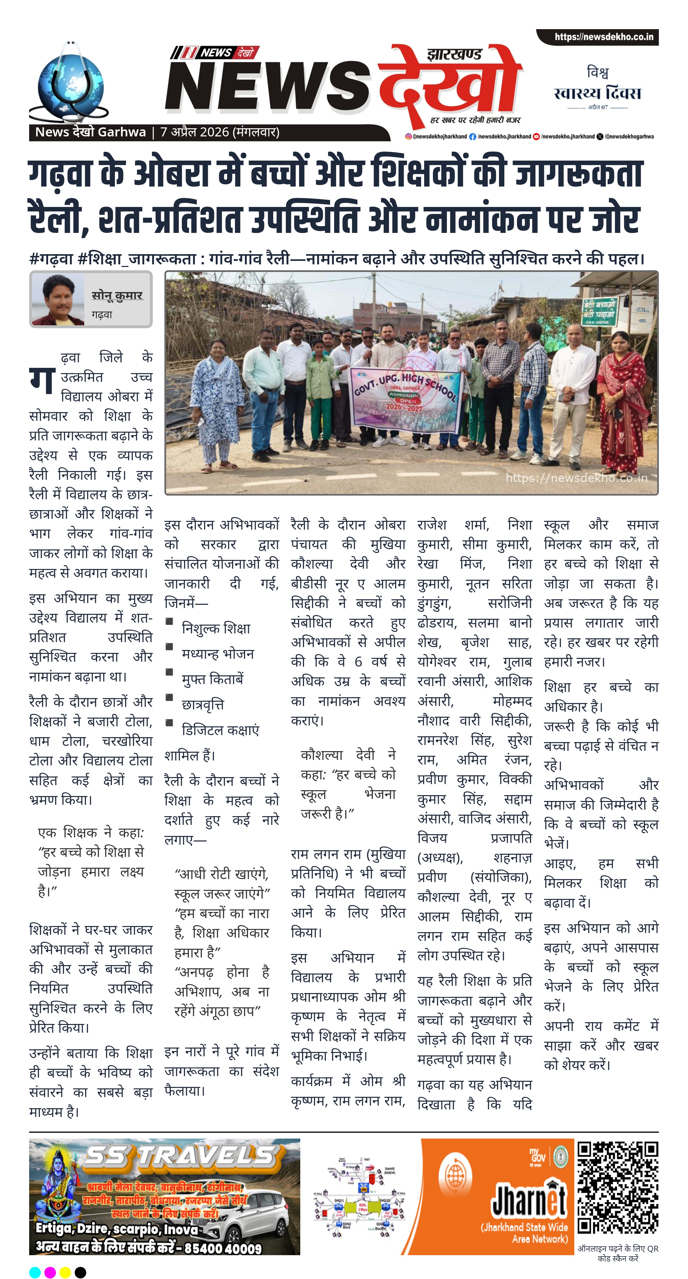 गढ़वा के उत्क्रमित उच्च विद्यालय ओबरा में छात्रों और शिक्षकों ने जागरूकता रैली निकाली। इसका उद्देश्य बच्चों की उपस्थिति बढ़ाना और नए नामांकन सुनिश्चित करना था। रैली में गांवों का भ्रमण कर अभिभावकों को शिक्षा के महत्व से अवगत कराया गया। जनप्रतिनिधियों ने भी लोगों से बच्चों को स्कूल भेजने की अपील की।