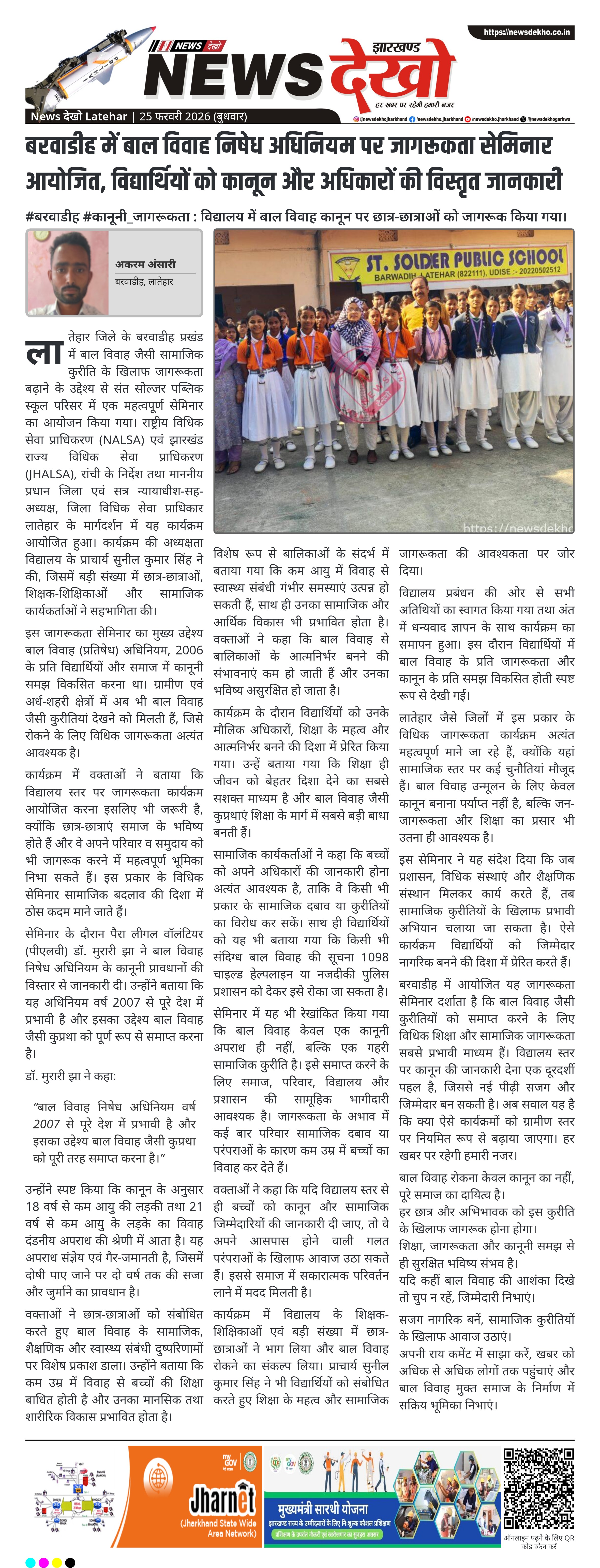 - संत सोल्जर पब्लिक स्कूल, बरवाडीह में बाल विवाह कानून पर जागरूकता सेमिनार का आयोजन।