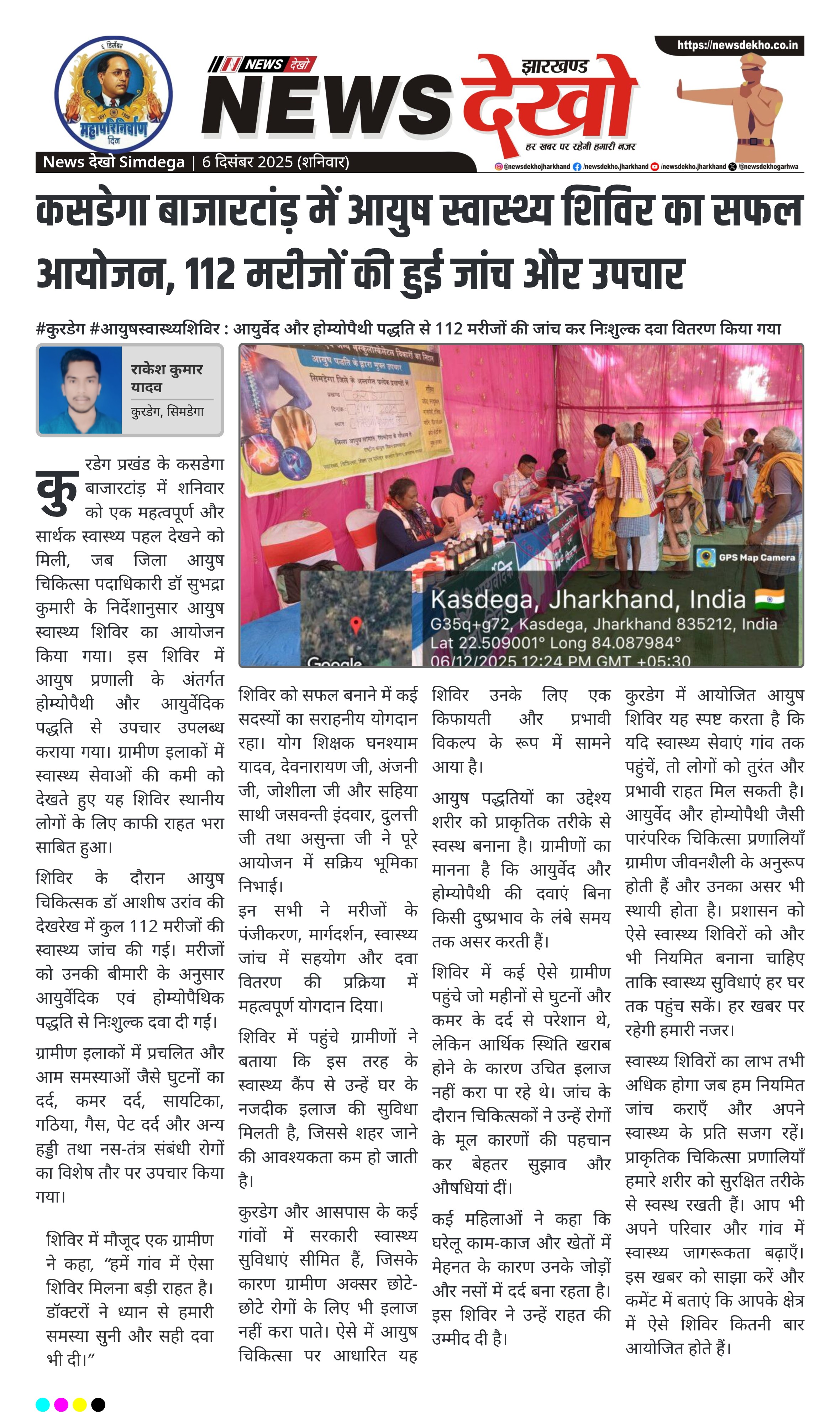 • कसडेगा बाजारटांड़, कुरडेग प्रखंड में आयुष स्वास्थ्य शिविर आयोजित।