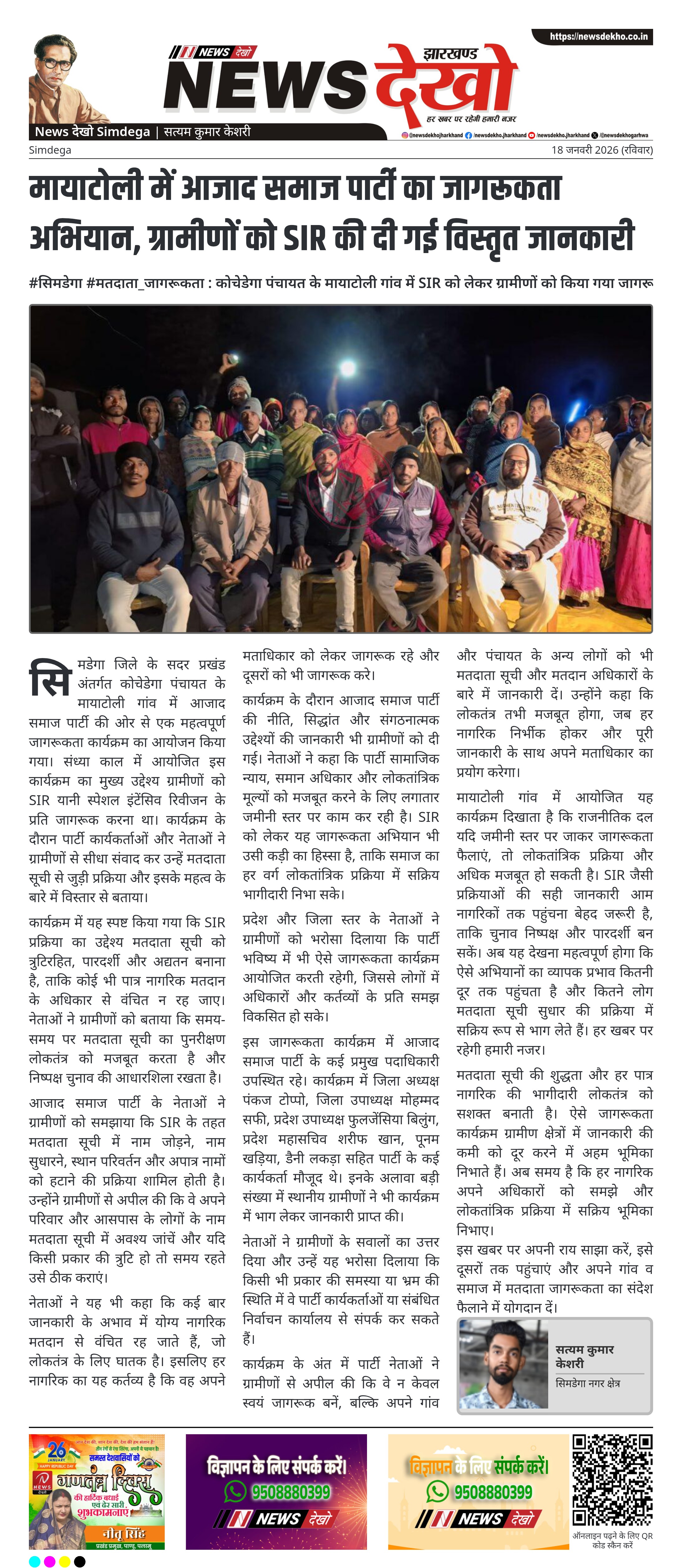 सिमडेगा जिले के सदर प्रखंड अंतर्गत कोचेडेगा पंचायत के मायाटोली गांव में आजाद समाज पार्टी की ओर से एक महत्वपूर्ण जागरूकता कार्यक्रम का आयोजन किया गया। संध्या काल में आयोजित इस कार्यक्रम का मुख्य उद्देश्य ग्रामीणों को SIR यानी स्पेशल इंटेंसिव रिवीजन के प्रति जागरूक करना था। कार्यक्रम के दौरान पार्टी कार्यकर्ताओं और नेताओं ने ग्रामीणों से सीधा संवाद कर उन्हें मतदाता सूची से जुड़ी प्रक्रिया और इसके महत्व के बारे में विस्तार से बताया।