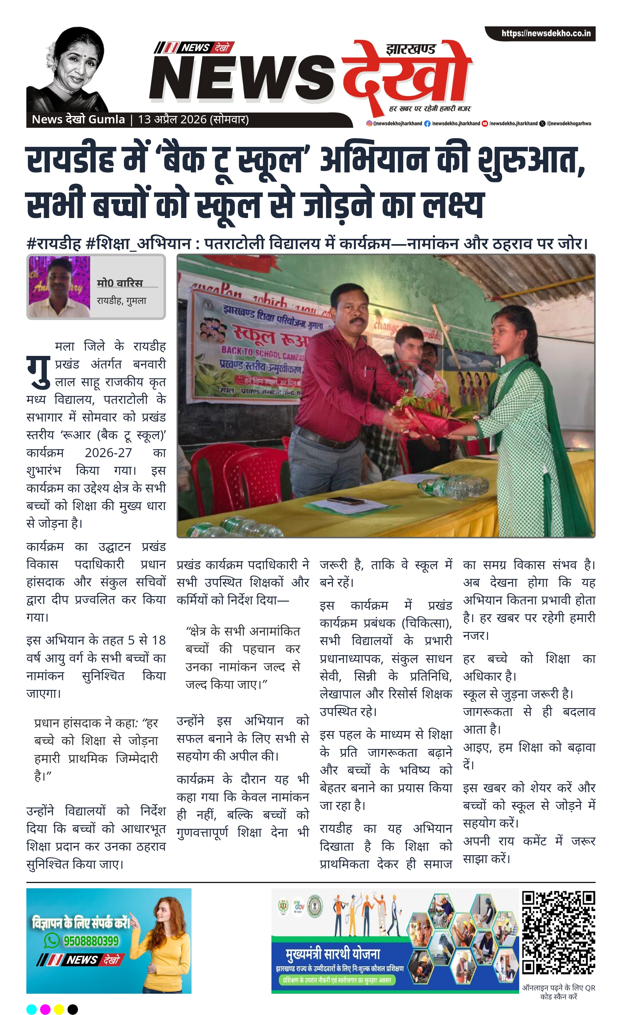 गुमला के रायडीह प्रखंड में बैक टू स्कूल कार्यक्रम 2026-27 की शुरुआत की गई। इसका उद्देश्य 5 से 18 वर्ष के बच्चों को स्कूल से जोड़ना है। अधिकारियों ने सभी अनामांकित बच्चों का नामांकन सुनिश्चित करने के निर्देश दिए। कार्यक्रम में शिक्षा से जुड़े कई पदाधिकारी शामिल हुए।