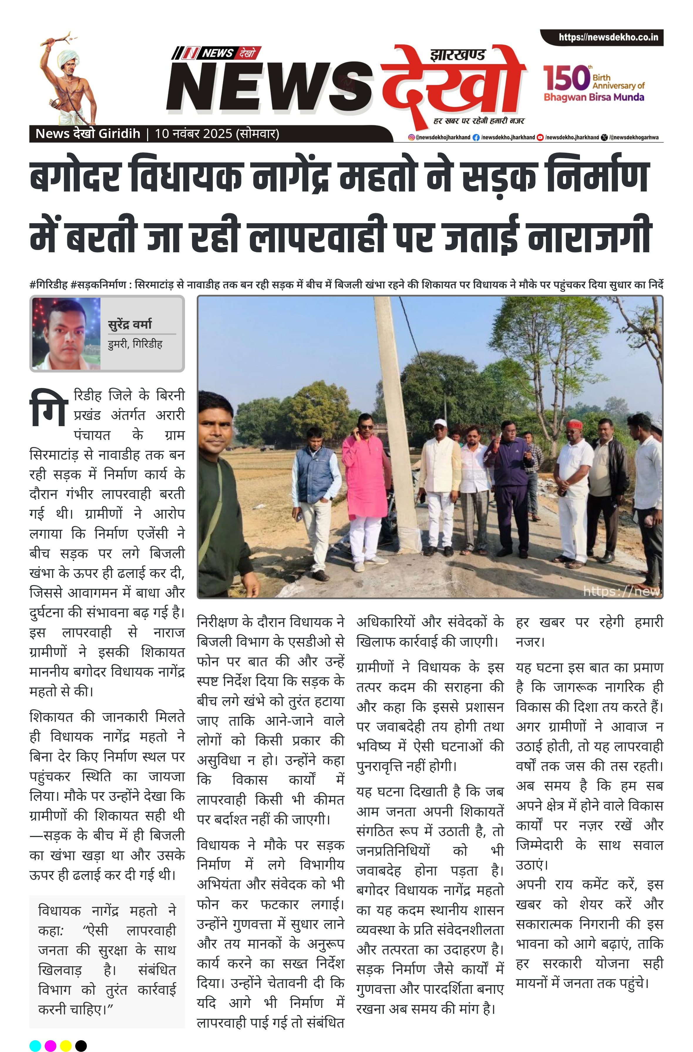 गिरिडीह जिले के बिरनी प्रखंड अंतर्गत अरारी पंचायत के ग्राम सिरमाटांड़ से नावाडीह तक बन रही सड़क में निर्माण कार्य के दौरान गंभीर लापरवाही बरती गई थी। ग्रामीणों ने आरोप लगाया कि निर्माण एजेंसी ने बीच सड़क पर लगे बिजली खंभा के ऊपर ही ढलाई कर दी, जिससे आवागमन में बाधा और दुर्घटना की संभावना बढ़ गई है। इस लापरवाही से नाराज ग्रामीणों ने इसकी शिकायत माननीय बगोदर विधायक नागेंद्र महतो से की।