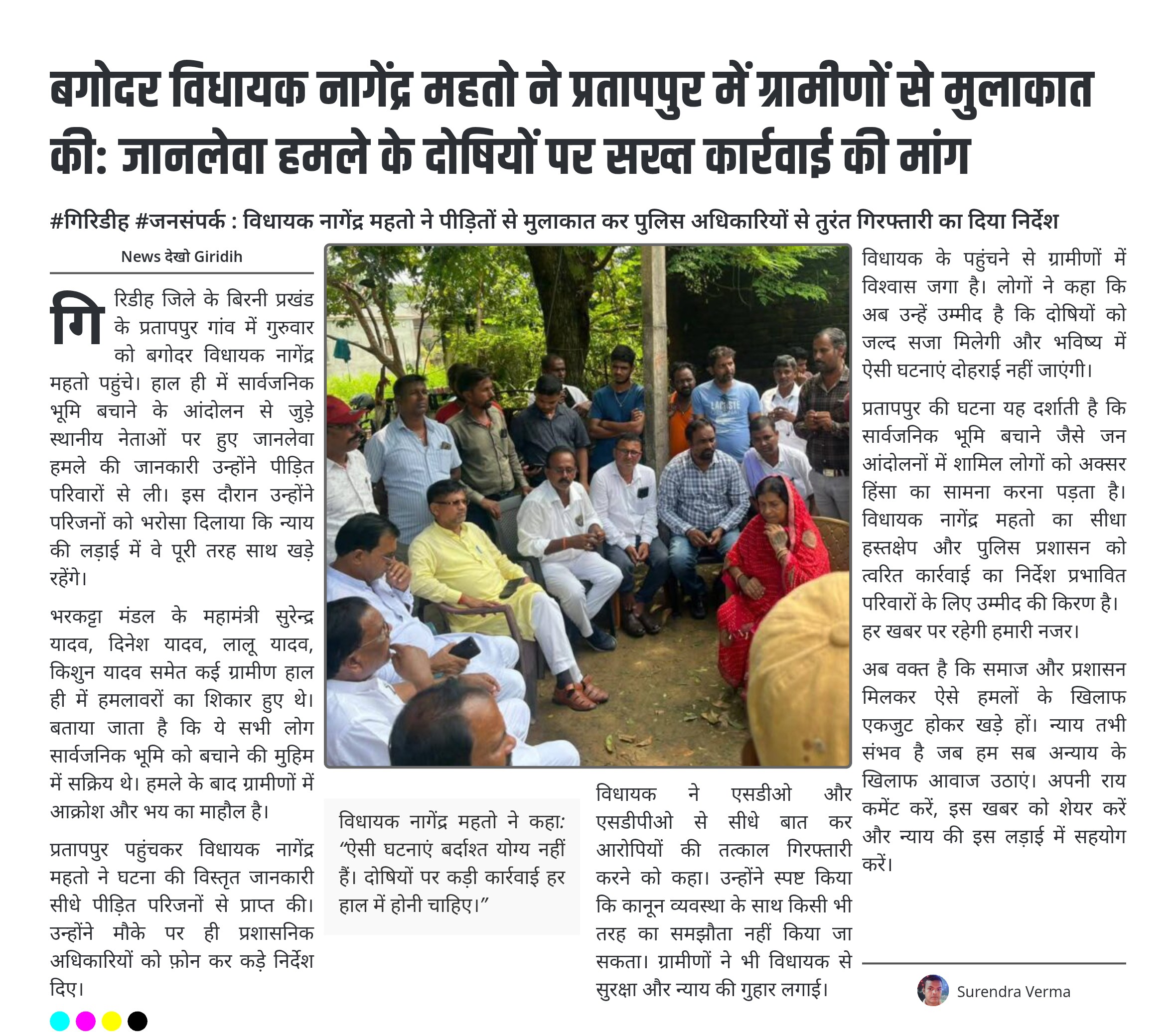 गिरिडीह जिले के बिरनी प्रखंड के प्रतापपुर गांव में गुरुवार को बगोदर विधायक नागेंद्र महतो पहुंचे। हाल ही में सार्वजनिक भूमि बचाने के आंदोलन से जुड़े स्थानीय नेताओं पर हुए जानलेवा हमले की जानकारी उन्होंने पीड़ित परिवारों से ली। इस दौरान उन्होंने परिजनों को भरोसा दिलाया कि न्याय की लड़ाई में वे पूरी तरह साथ खड़े रहेंगे।