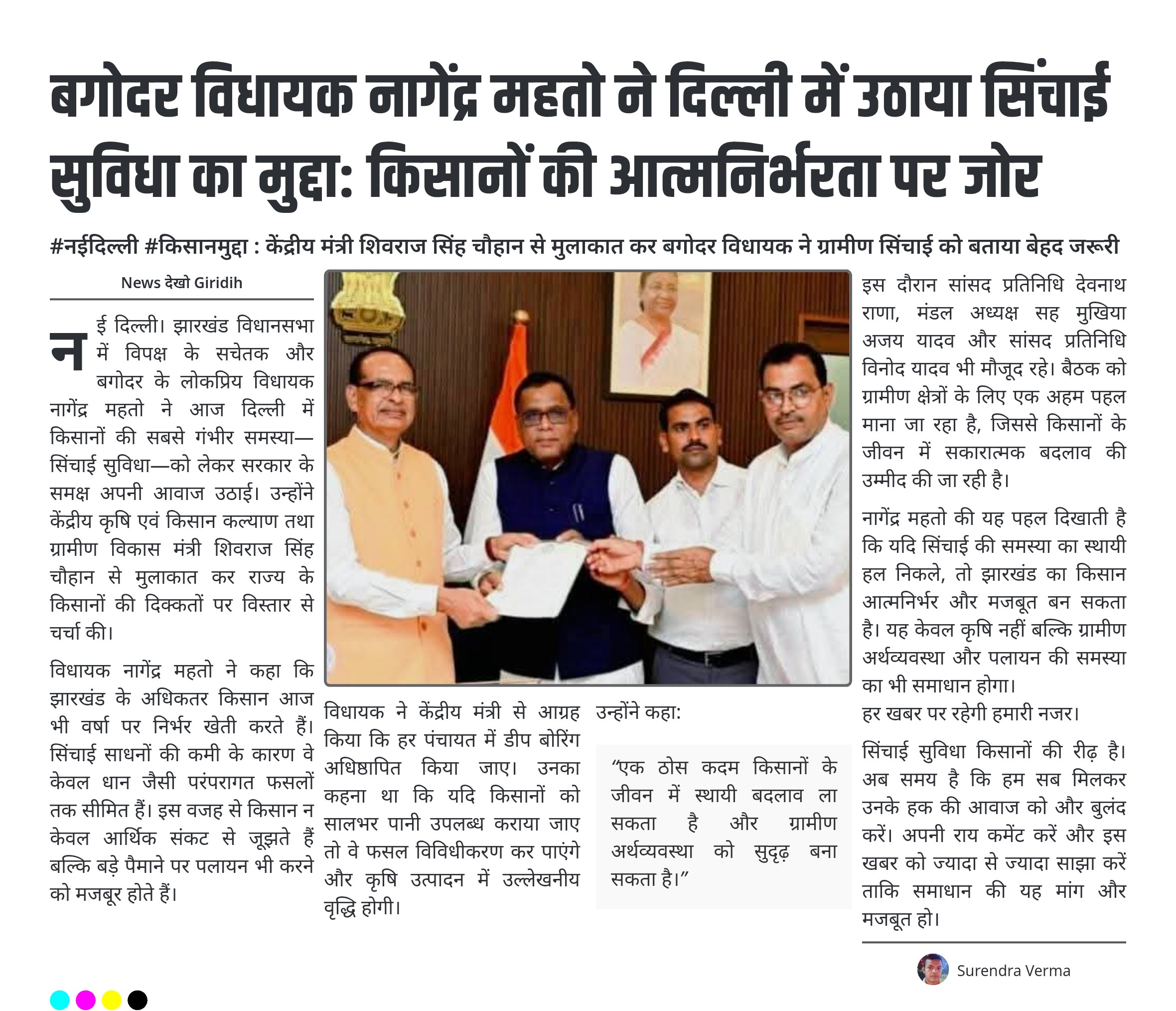 बगोदर विधायक नागेंद्र महतो ने दिल्ली में उठाया सिंचाई सुविधा का मुद्दा: किसानों की आत्मनिर्भरता पर जोर