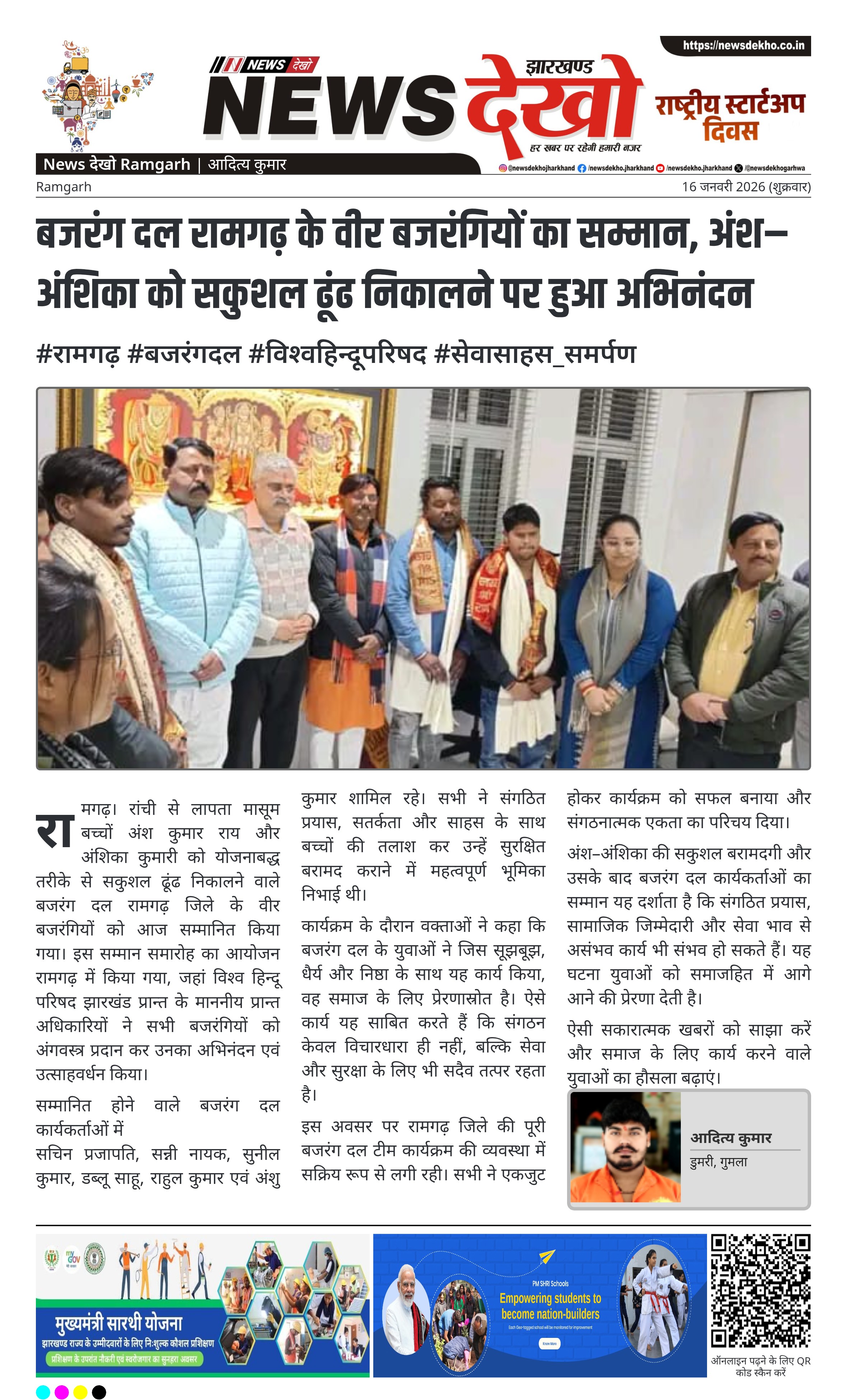 अंश–अंशिका की सकुशल बरामदगी और उसके बाद बजरंग दल कार्यकर्ताओं का सम्मान यह दर्शाता है कि संगठित प्रयास, सामाजिक जिम्मेदारी और सेवा भाव से असंभव कार्य भी संभव हो सकते हैं। यह घटना युवाओं को समाजहित में आगे आने की प्रेरणा देती है।