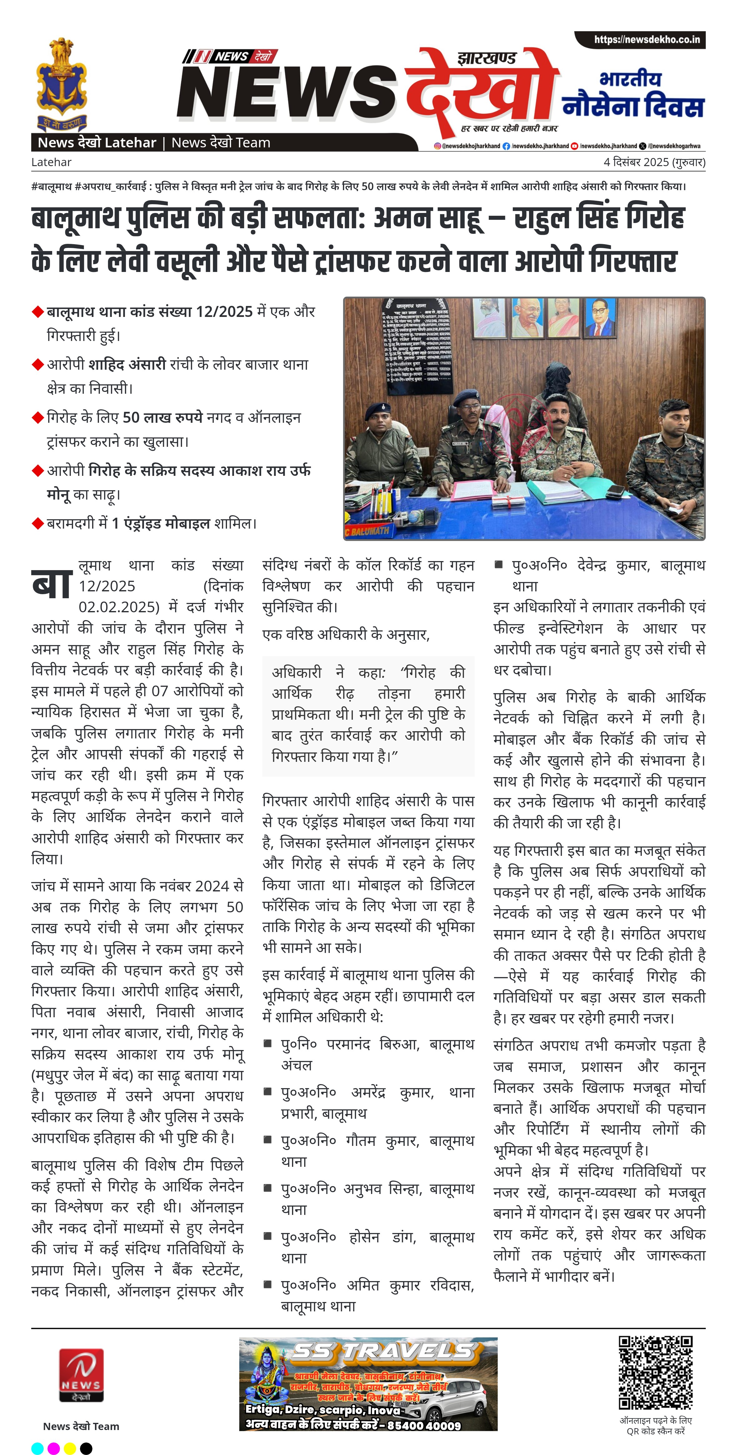 - बालूमाथ थाना कांड संख्या 12/2025 में एक और गिरफ्तारी हुई।