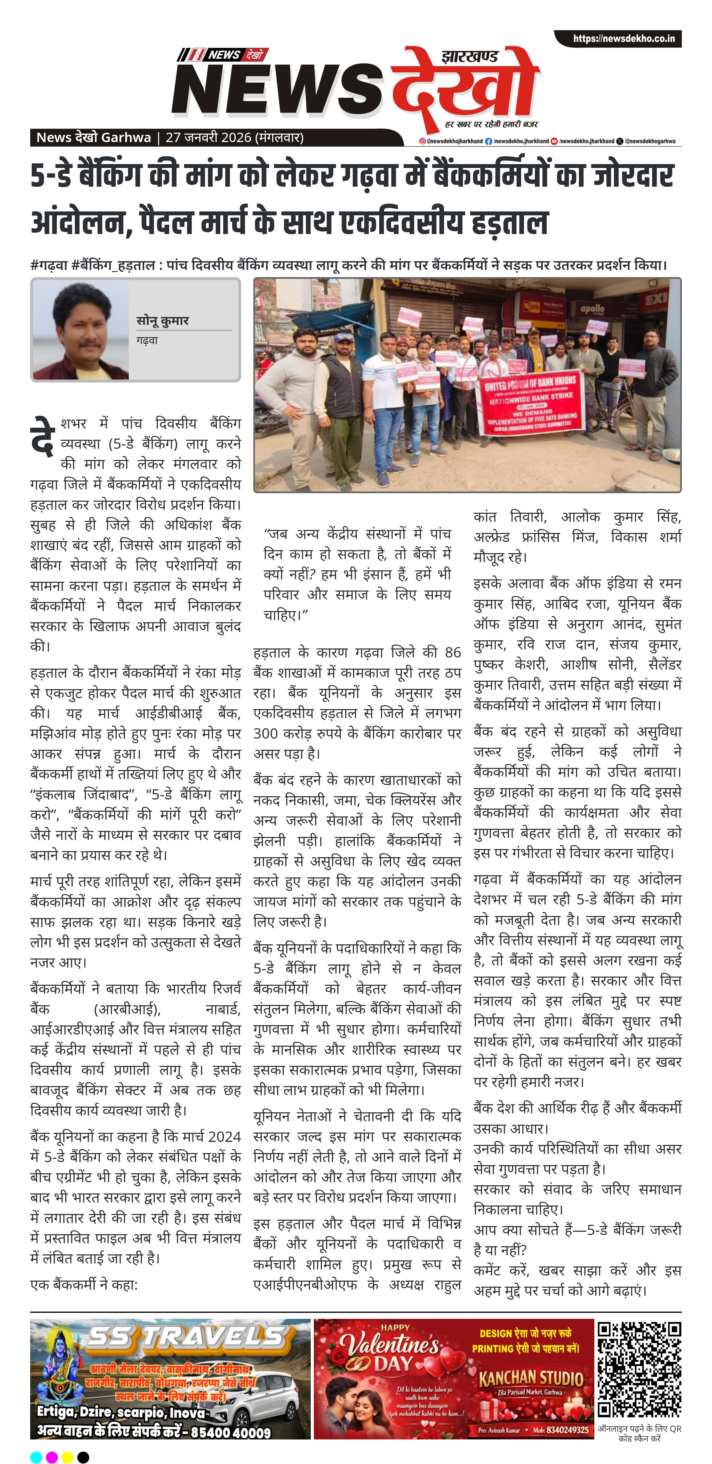 • गढ़वा जिले में 5-डे बैंकिंग की मांग को लेकर एकदिवसीय हड़ताल।