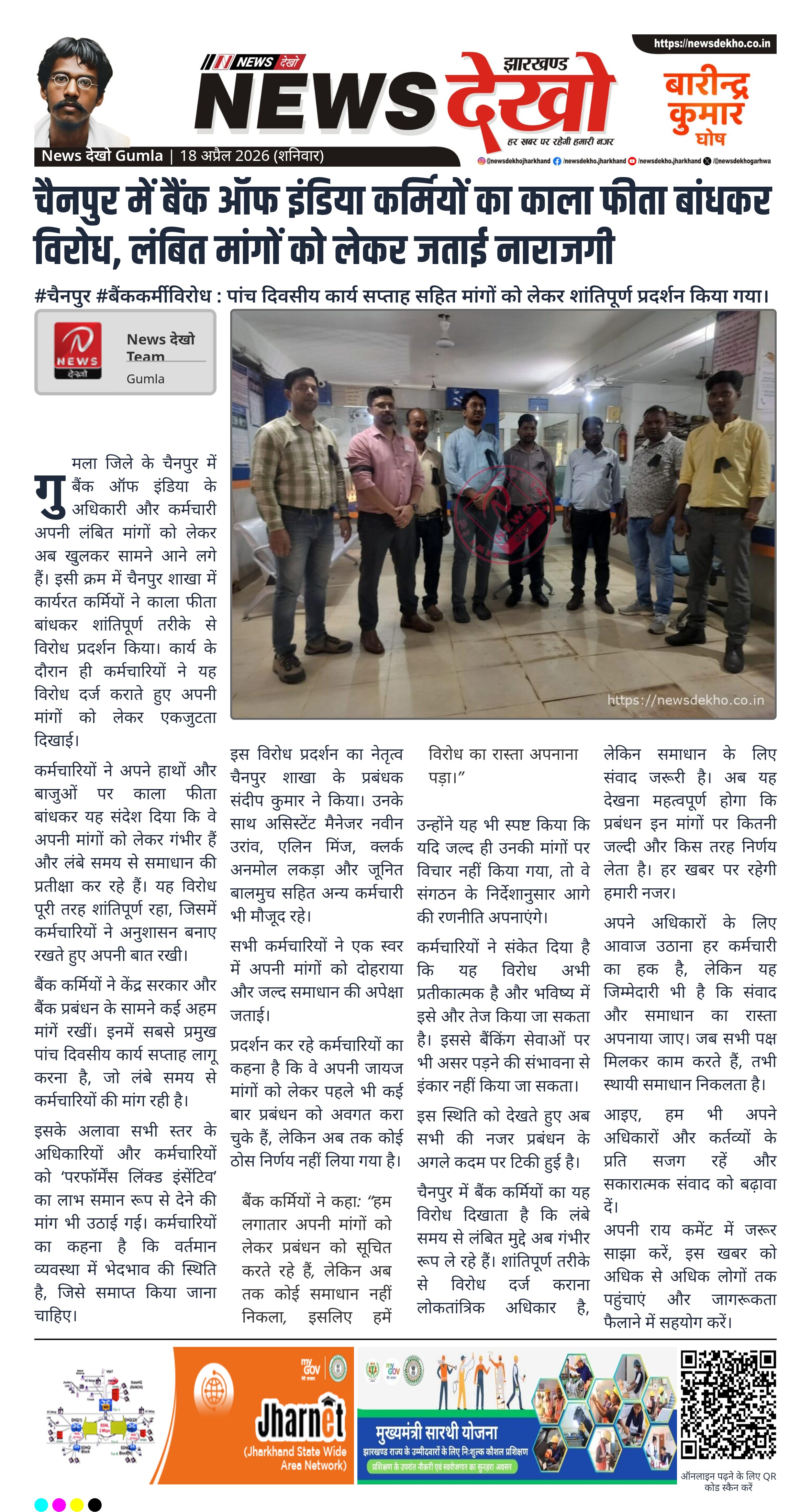 इस विरोध प्रदर्शन का नेतृत्व चैनपुर शाखा के प्रबंधक संदीप कुमार ने किया। उनके साथ असिस्टेंट मैनेजर नवीन उरांव, एलिन मिंज, क्लर्क अनमोल लकड़ा और जूनित बालमुच सहित अन्य कर्मचारी भी मौजूद रहे।