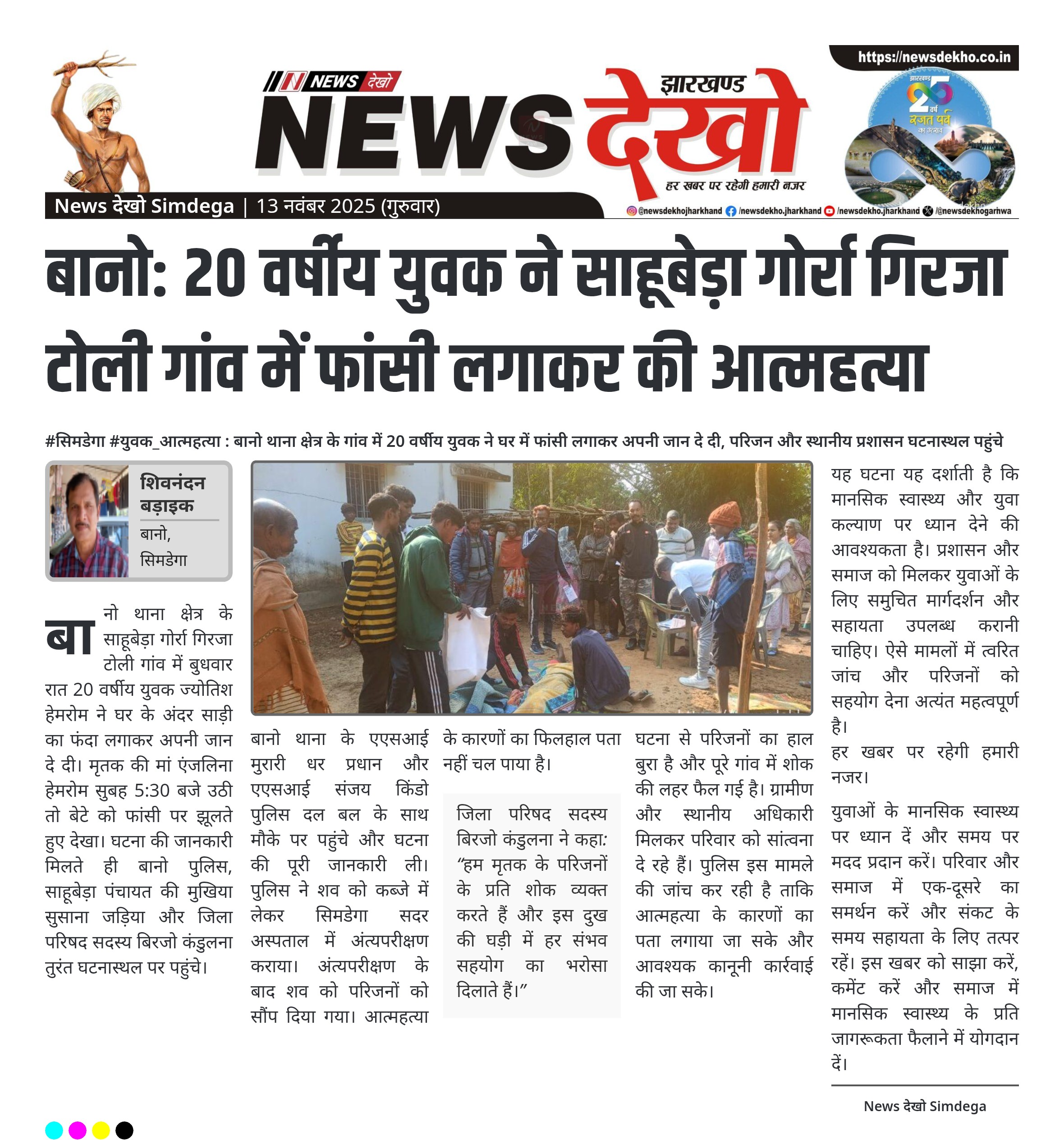 - सिमडेगा जिले के बानो थाना क्षेत्र के साहूबेड़ा गोर्रा गिरजा टोली गांव में युवक ने आत्महत्या की।