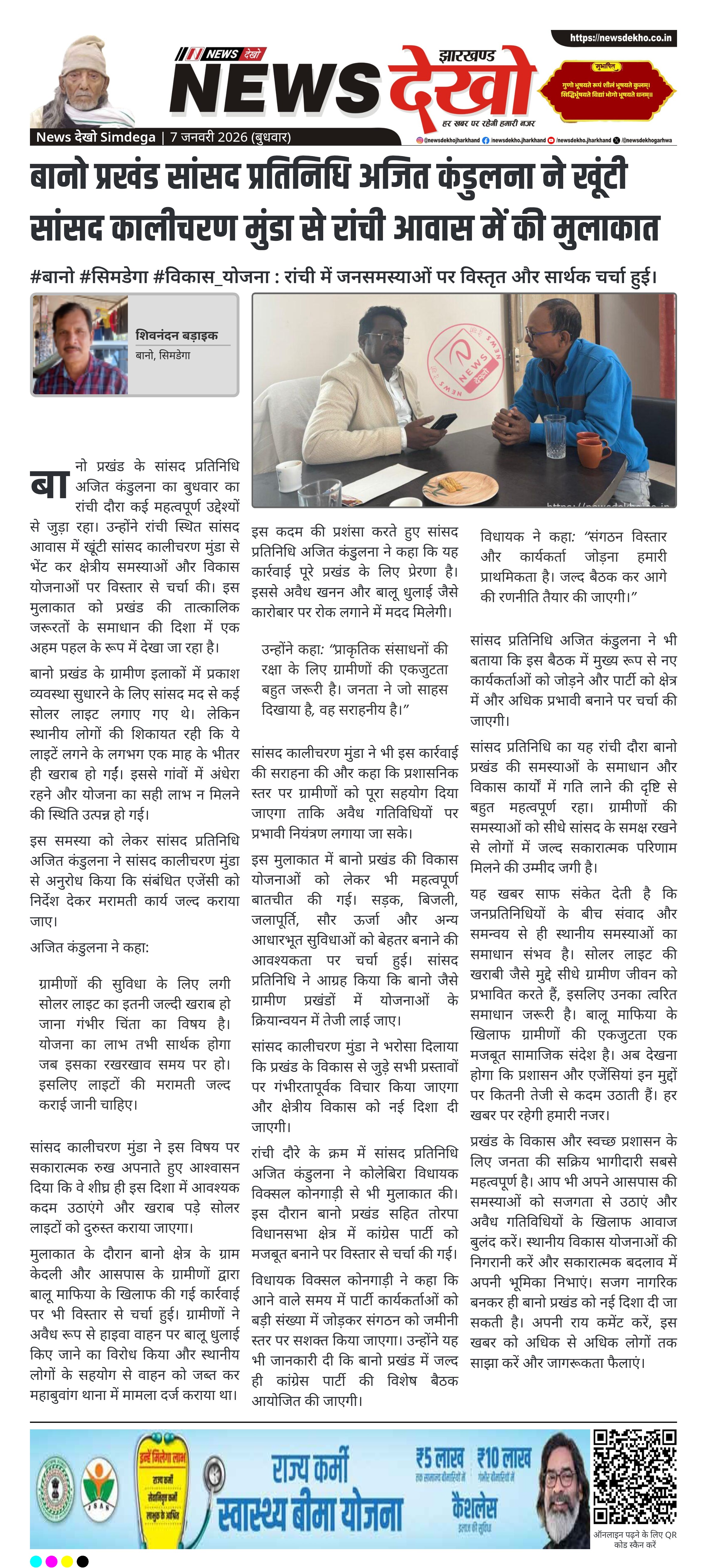 बानो प्रखंड सांसद प्रतिनिधि अजित कंडुलना ने बुधवार को रांची स्थित आवास में खूंटी सांसद कालीचरण मुंडा से मुलाकात की। इस दौरान सांसद मद से लगी सोलर लाइट के एक माह के भीतर खराब होने की समस्या का समाधान जल्द कराने पर बात हुई। ग्रामीणों द्वारा बालू माफिया के खिलाफ हाइवा वाहन जब्त करने और महाबुवांग थाना में मामला दर्ज कराने की कार्रवाई की सराहना की गई। बैठक में प्रखंड की विकास योजनाओं को गति देने पर भी विस्तार से विचार-विमर्श किया गया।