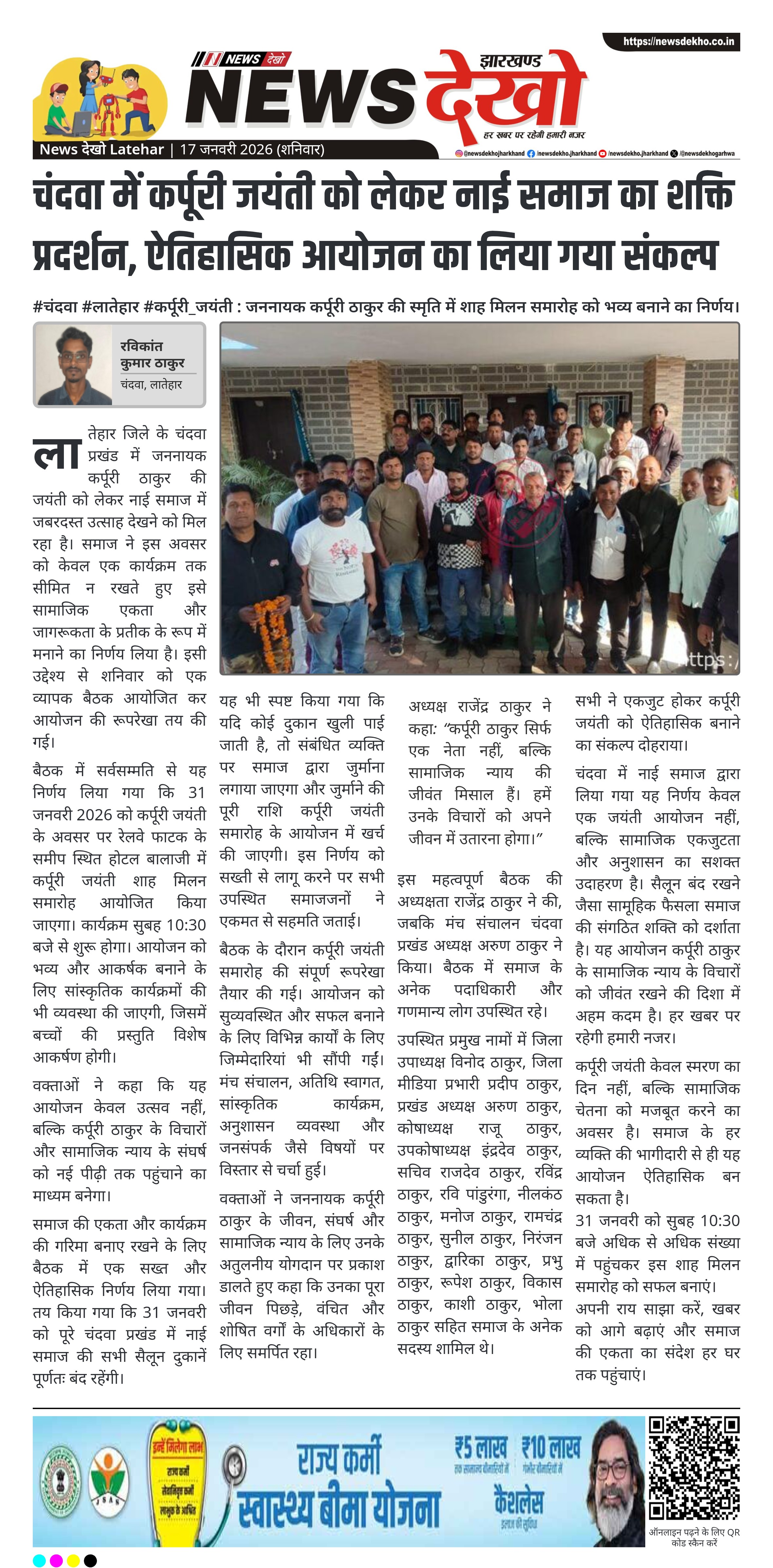लातेहार जिले के चंदवा प्रखंड में जननायक कर्पूरी ठाकुर की जयंती को ऐतिहासिक स्वरूप देने की तैयारी तेज हो गई है। शनिवार 17 जनवरी 2026 को इंदिरा गांधी चौक स्थित आईबी परिसर में नाई समाज की अहम बैठक आयोजित हुई, जिसमें सैकड़ों समाजजनों ने भाग लिया। बैठक में 31 जनवरी 2026 को भव्य कर्पूरी जयंती शाह मिलन समारोह आयोजित करने का सर्वसम्मत निर्णय लिया गया। आयोजन को समाज की एकता, जागरूकता और सामाजिक सम्मान से जोड़ते हुए कई ठोस फैसले लिए गए।