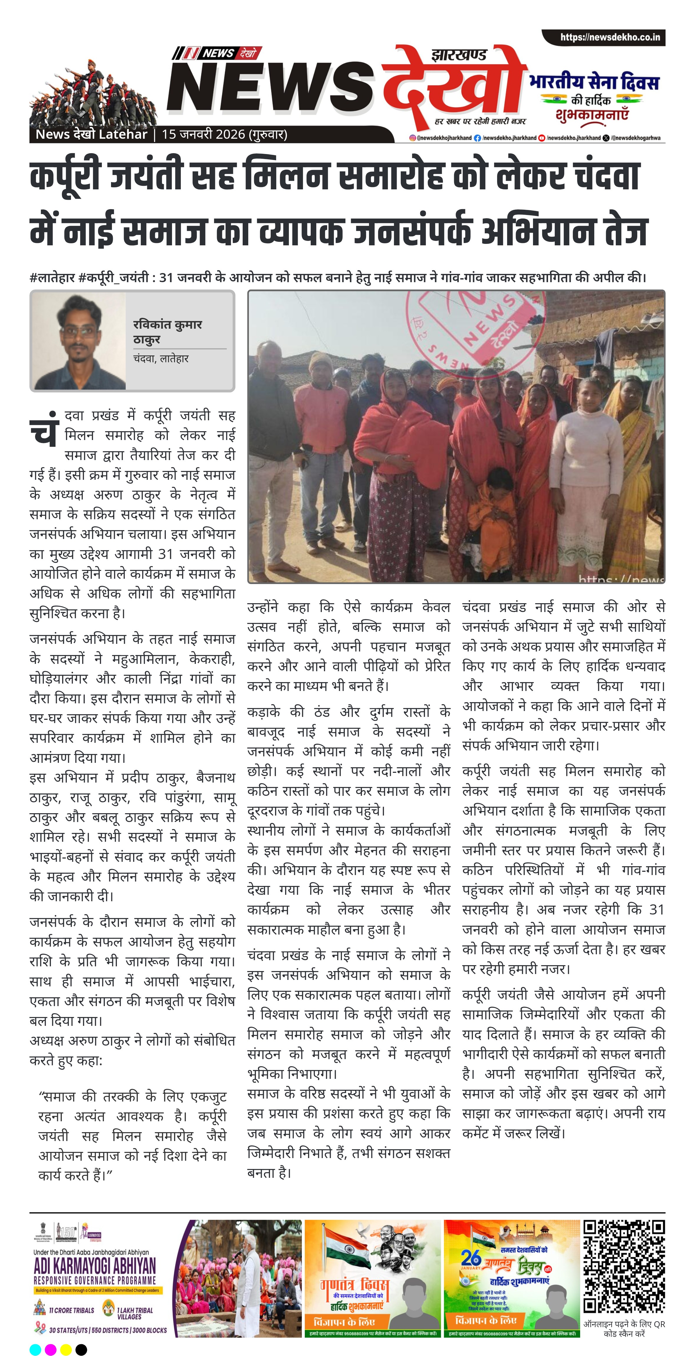 लातेहार जिले के चंदवा प्रखंड में 31 जनवरी को प्रस्तावित कर्पूरी जयंती सह मिलन समारोह को लेकर नाई समाज ने व्यापक जनसंपर्क अभियान चलाया। गुरुवार को समाज के अध्यक्ष के नेतृत्व में कार्यकर्ताओं ने कई गांवों का दौरा कर लोगों से प्रत्यक्ष संपर्क किया। अभियान का उद्देश्य समाज की अधिकतम भागीदारी सुनिश्चित करना और संगठनात्मक एकता को मजबूत करना है। यह पहल सामाजिक जागरूकता और सामूहिक सहभागिता के लिहाज से महत्वपूर्ण मानी जा रही है।