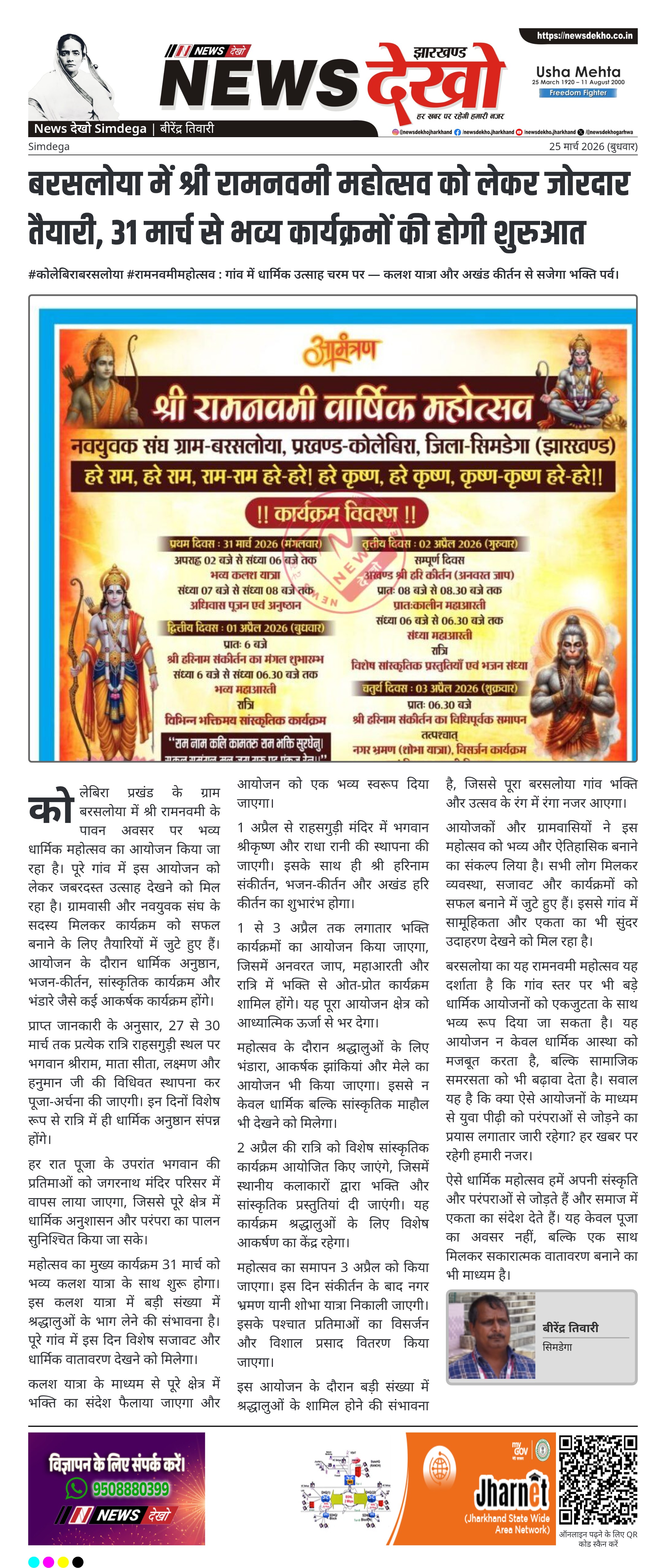 कोलेबिरा प्रखंड के बरसलोया गांव में श्री रामनवमी महोत्सव को लेकर व्यापक तैयारियां चल रही हैं। 27 मार्च से प्रारंभ होकर 3 अप्रैल तक विभिन्न धार्मिक और सांस्कृतिक कार्यक्रम आयोजित किए जाएंगे। 31 मार्च को कलश यात्रा के साथ मुख्य आयोजन शुरू होगा, जबकि 1 से 3 अप्रैल तक अखंड हरि कीर्तन और भजन कार्यक्रम होंगे। आयोजन को लेकर गांव में उत्साह और श्रद्धा का माहौल बना हुआ है।