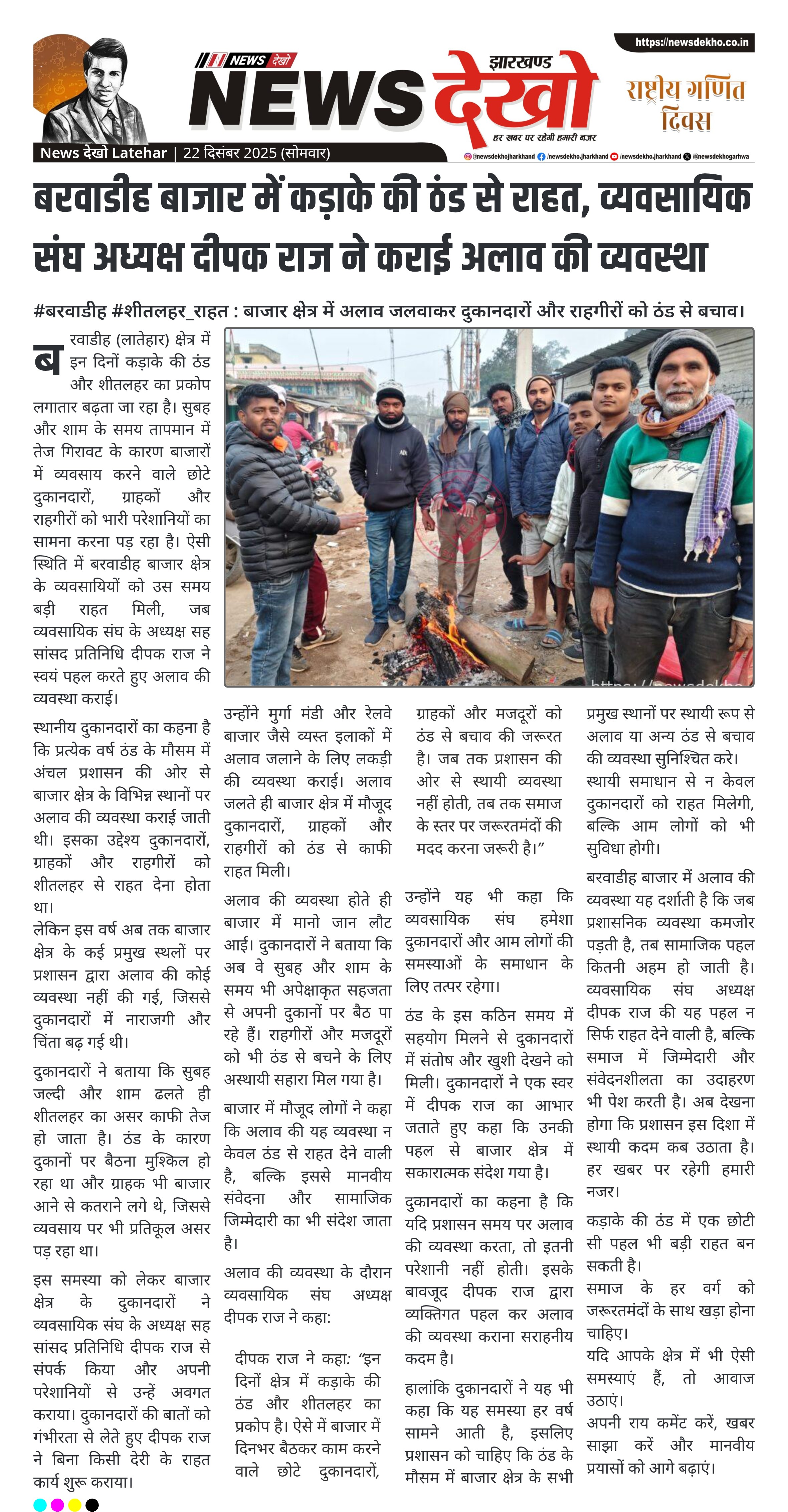 लातेहार जिले के बरवाडीह बाजार क्षेत्र में कड़ाके की ठंड और शीतलहर के बीच व्यवसायियों को बड़ी राहत मिली है। व्यवसायिक संघ के अध्यक्ष सह सांसद प्रतिनिधि दीपक राज ने मुर्गा मंडी और रेलवे बाजार में अलाव की व्यवस्था कराई। प्रशासनिक पहल के अभाव में की गई इस व्यवस्था से दुकानदारों और राहगीरों को ठंड से राहत मिली है।