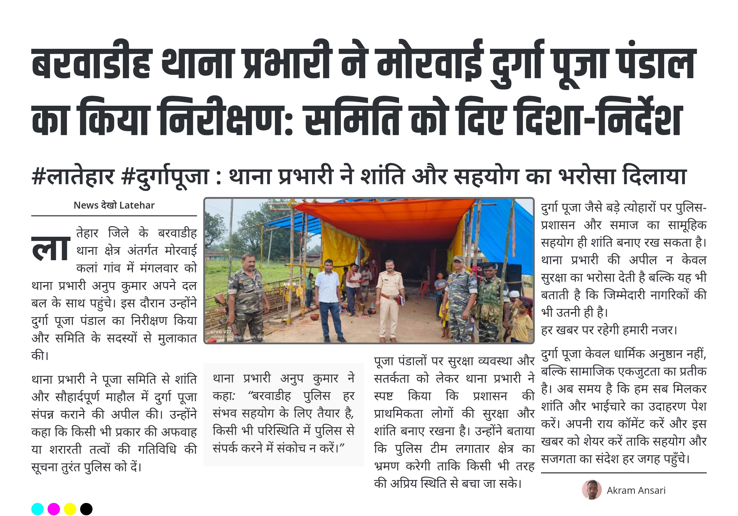 दुर्गा पूजा जैसे बड़े त्योहारों पर पुलिस-प्रशासन और समाज का सामूहिक सहयोग ही शांति बनाए रख सकता है। थाना प्रभारी की अपील न केवल सुरक्षा का भरोसा देती है बल्कि यह भी बताती है कि जिम्मेदारी नागरिकों की भी उतनी ही है।