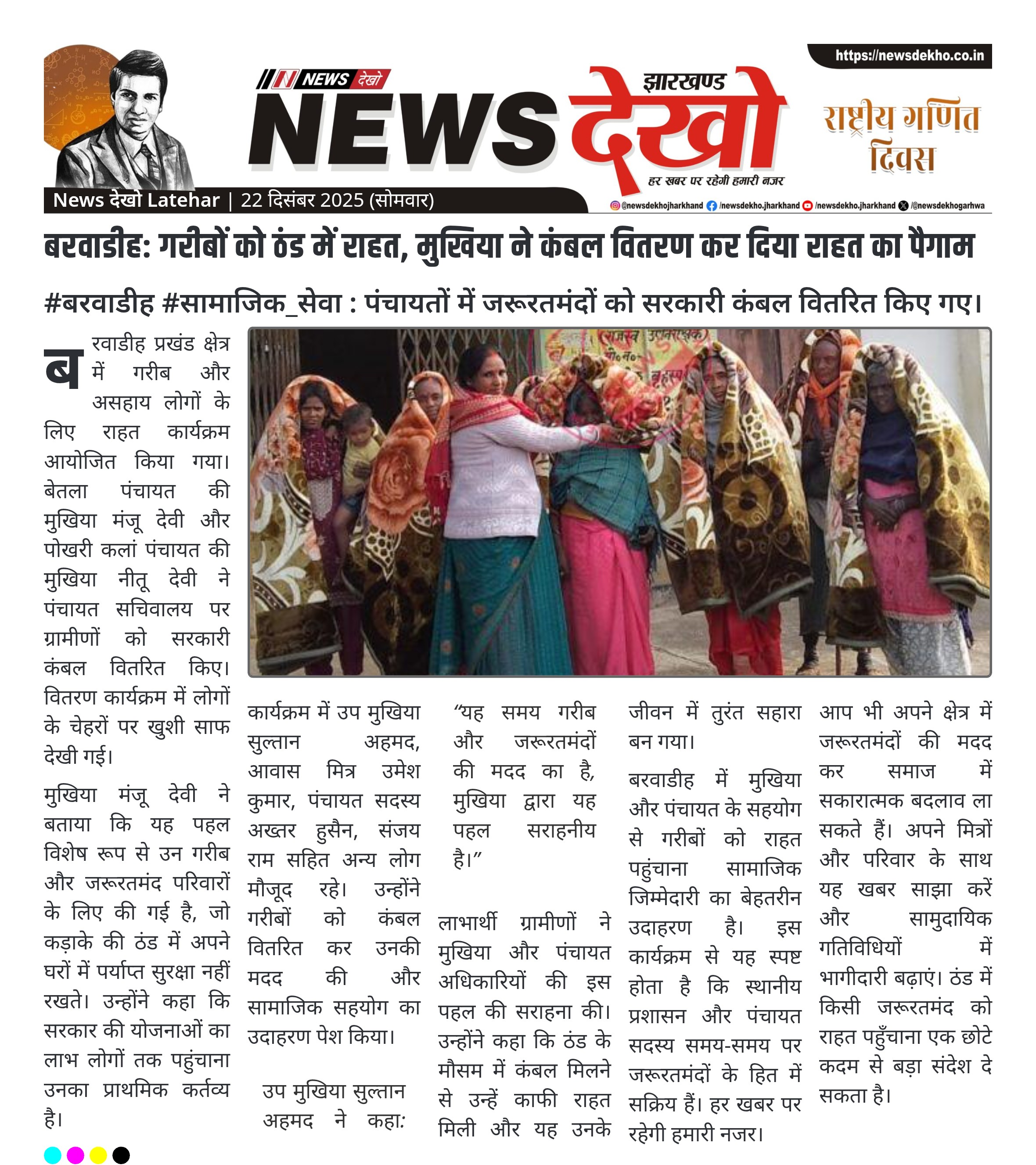 बरवाडीह प्रखंड क्षेत्र में गरीब और असहाय लोगों के लिए राहत कार्यक्रम आयोजित किया गया। बेतला पंचायत की मुखिया मंजू देवी और पोखरी कलां पंचायत की मुखिया नीतू देवी ने पंचायत सचिवालय पर ग्रामीणों को सरकारी कंबल वितरित किए। वितरण कार्यक्रम में लोगों के चेहरों पर खुशी साफ देखी गई।