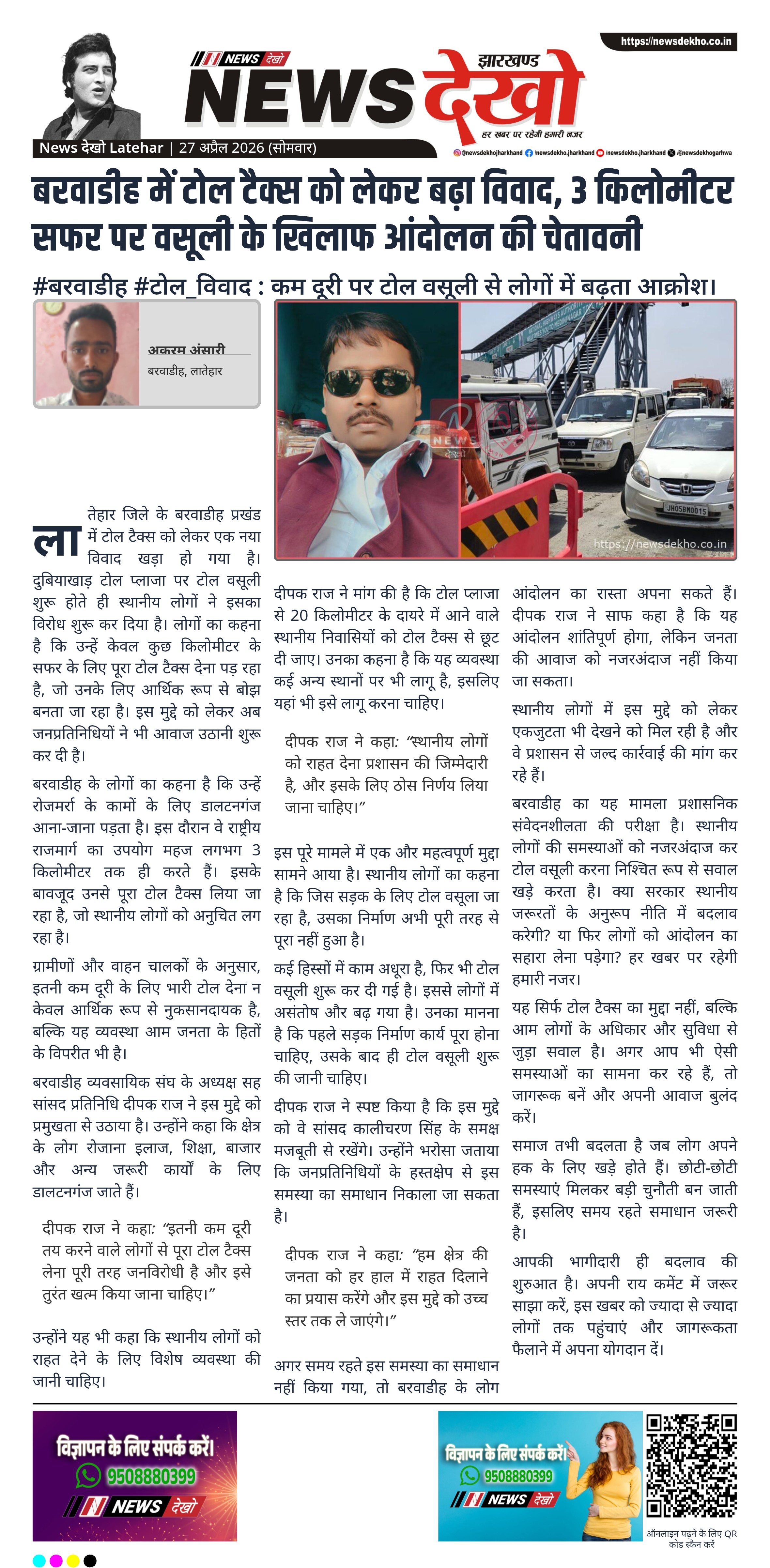 - दुबियाखाड़ टोल प्लाजा पर वसूली से बरवाडीह के लोग नाराज।