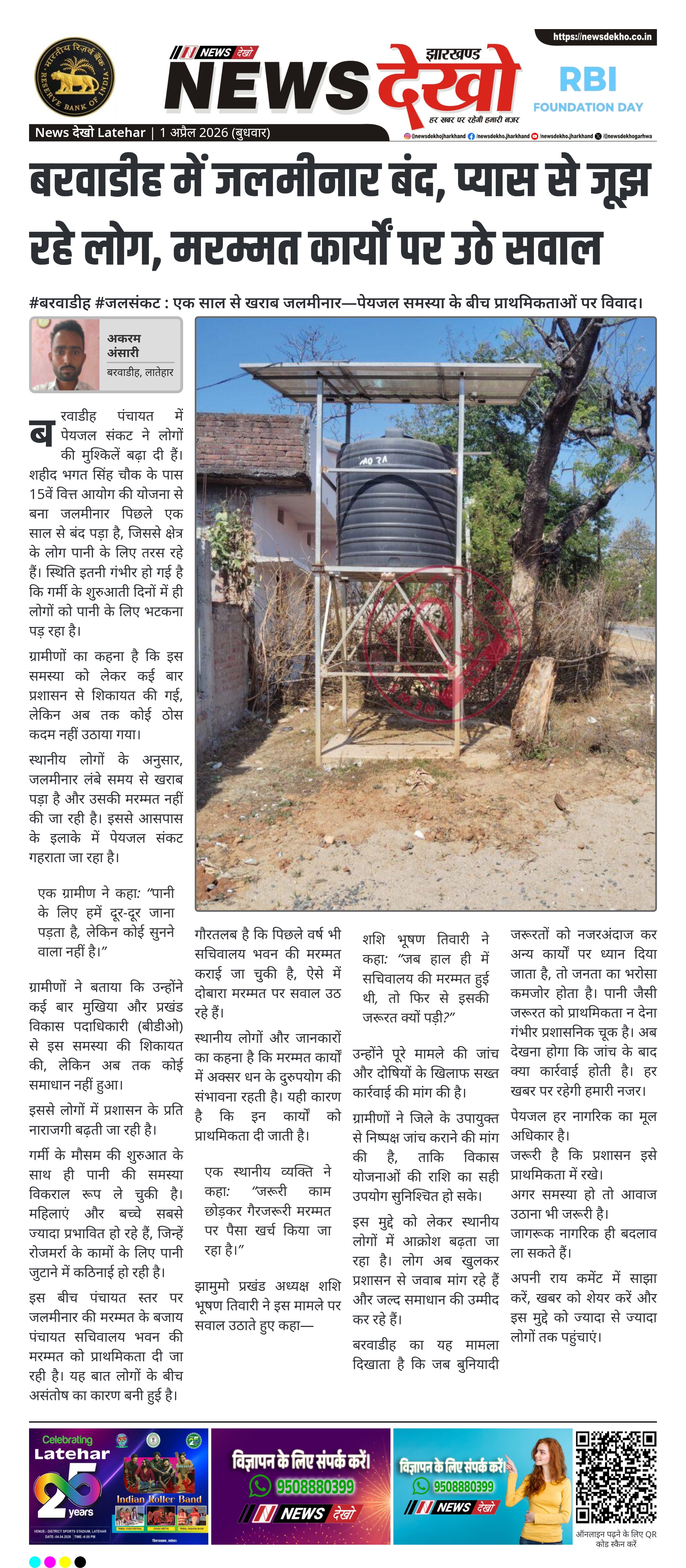 लातेहार के बरवाडीह पंचायत में जलमीनार पिछले एक वर्ष से बंद है, जिससे पेयजल संकट गहरा गया है। ग्रामीणों ने कई बार शिकायत के बावजूद सुधार नहीं होने का आरोप लगाया है। इस बीच पंचायत सचिवालय की मरम्मत पर खर्च को लेकर सवाल उठ रहे हैं। मामले को लेकर जांच की मांग तेज हो गई है।