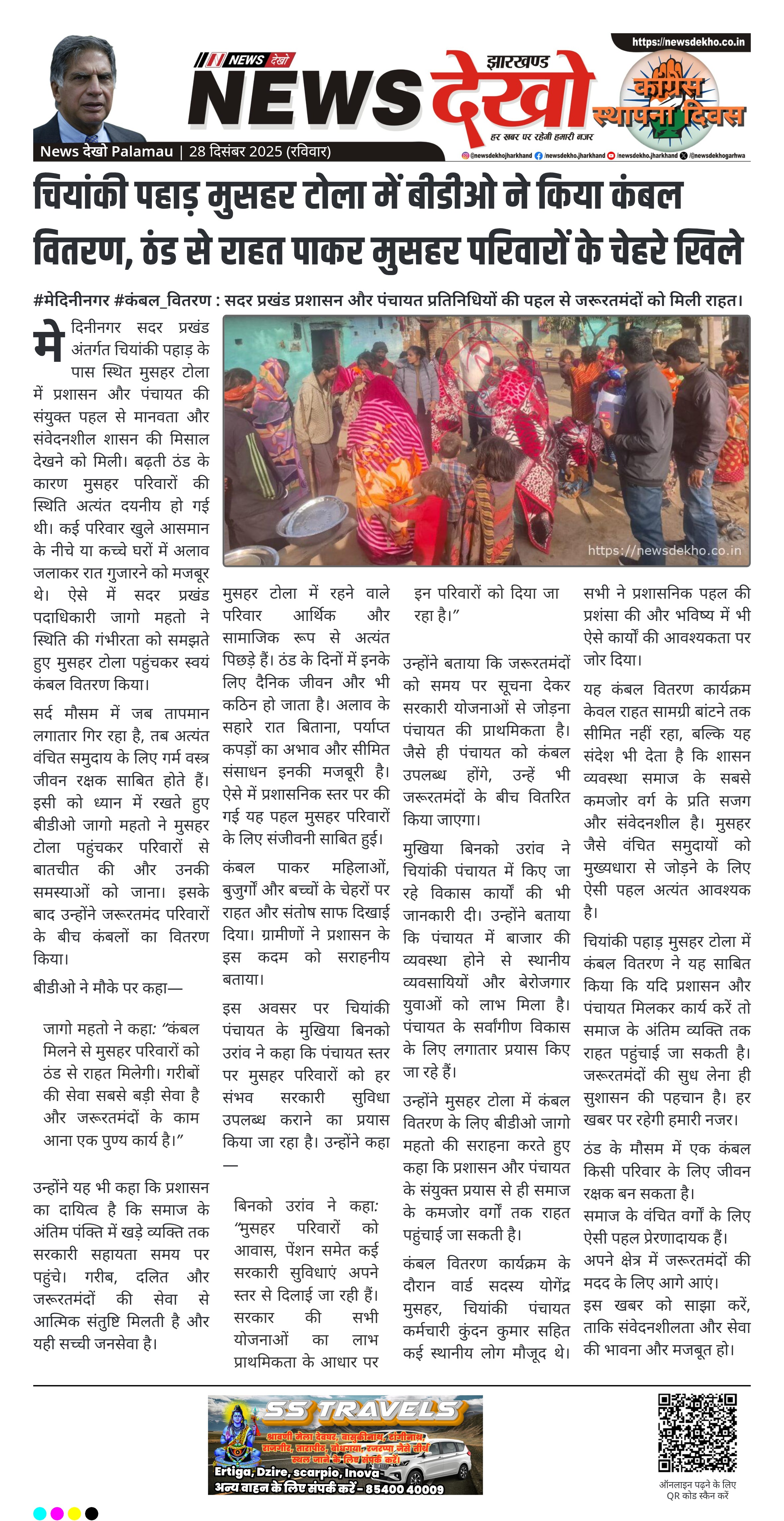 मेदिनीनगर सदर प्रखंड के चियांकी पहाड़ स्थित मुसहर टोला में कड़ाके की ठंड के बीच प्रशासनिक संवेदनशीलता देखने को मिली, जब प्रखंड विकास पदाधिकारी जागो महतो ने स्वयं पहुंचकर मुसहर परिवारों के बीच कंबल का वितरण किया। इस पहल में चियांकी पंचायत के मुखिया बिनको उरांव भी मौजूद रहे। ठंड से जूझ रहे अत्यंत वंचित समुदाय को राहत पहुंचाने के उद्देश्य से किया गया यह वितरण प्रशासन और पंचायत के समन्वय का उदाहरण बना।