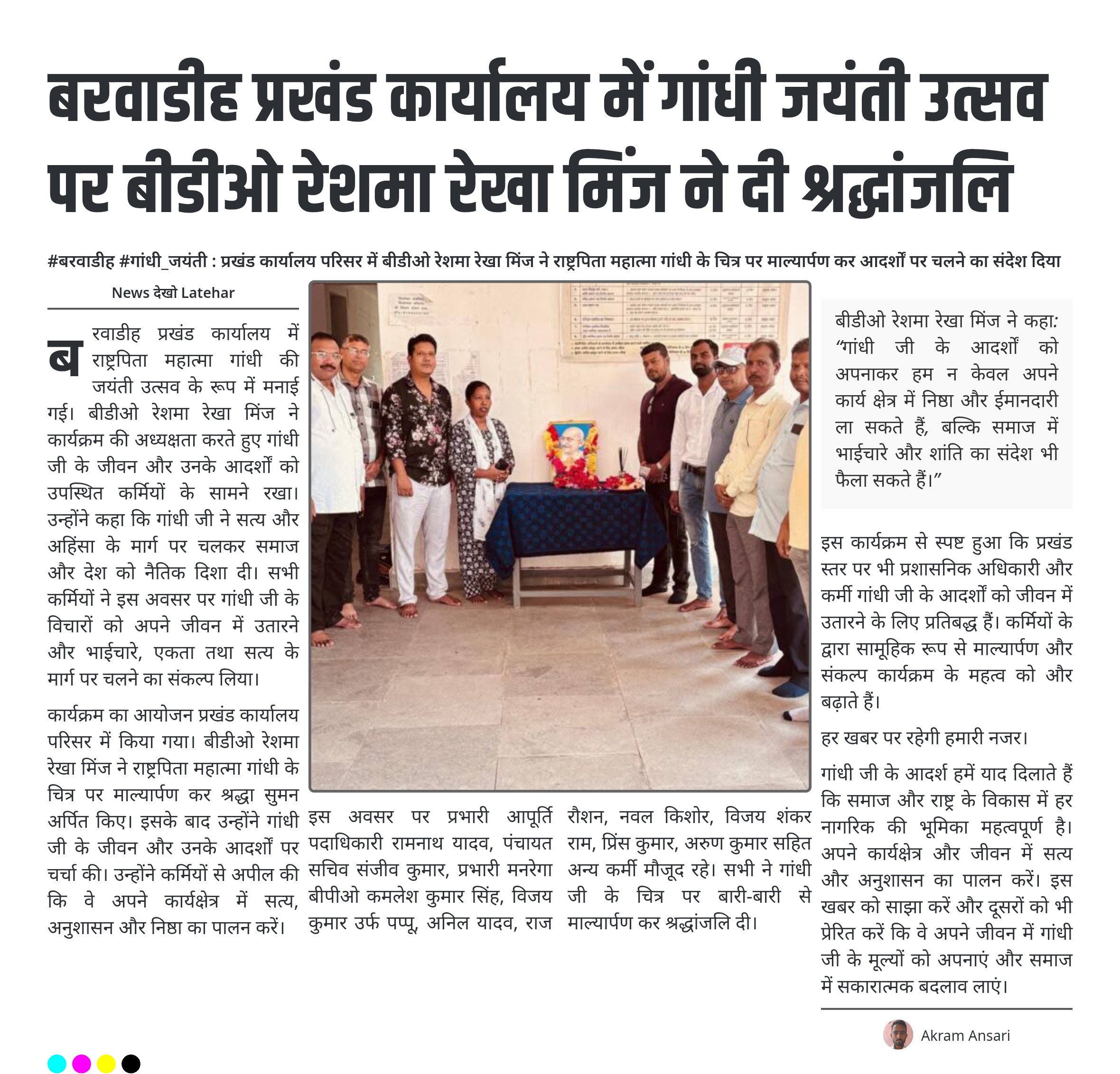 बीडीओ रेशमा रेखा मिंज ने कहा: “गांधी जी के आदर्शों को अपनाकर हम न केवल अपने कार्य क्षेत्र में निष्ठा और ईमानदारी ला सकते हैं, बल्कि समाज में भाईचारे और शांति का संदेश भी फैला सकते हैं।”