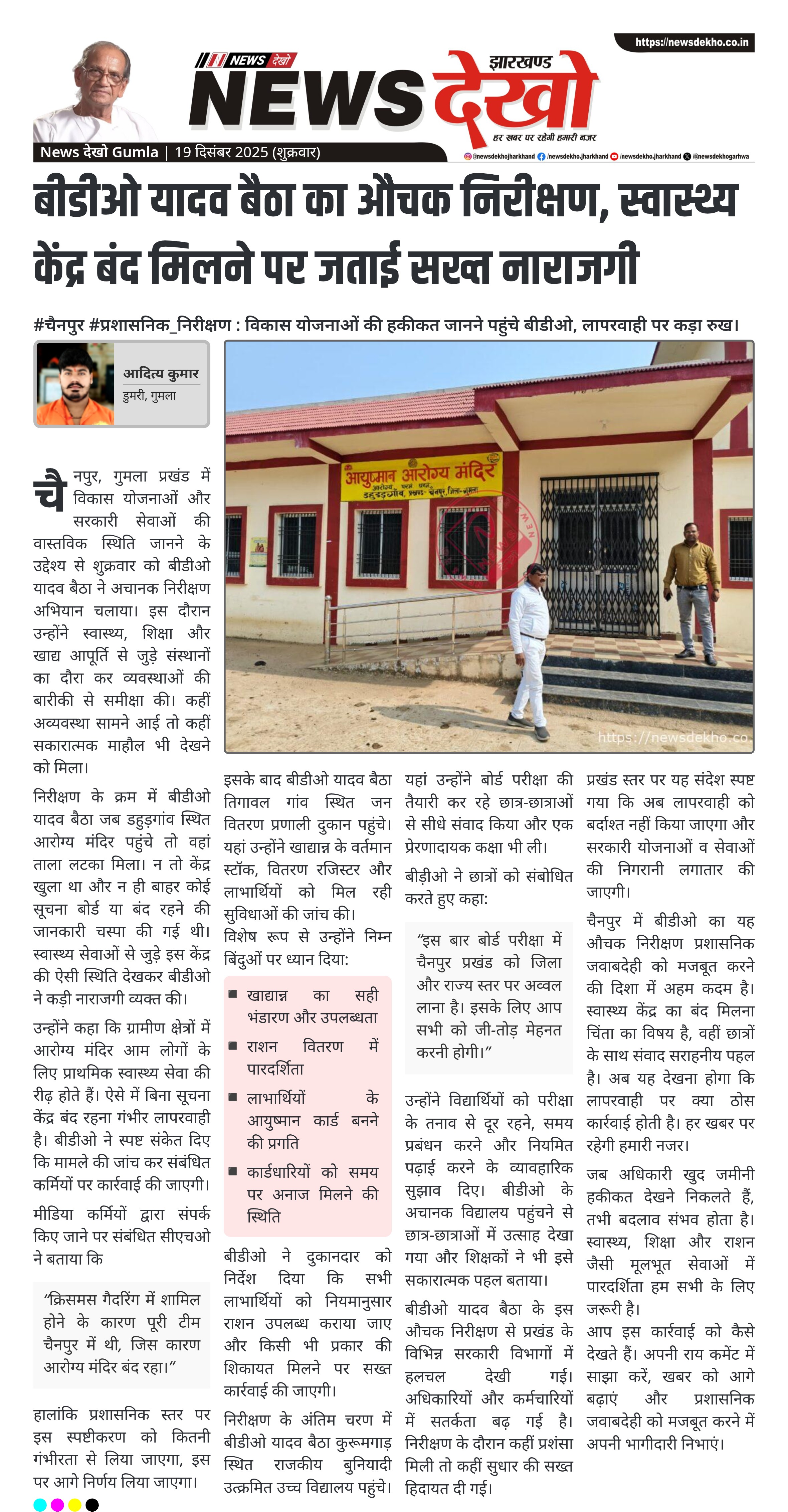 चैनपुर, गुमला प्रखंड में विकास योजनाओं और सरकारी सेवाओं की वास्तविक स्थिति जानने के उद्देश्य से शुक्रवार को बीडीओ यादव बैठा ने अचानक निरीक्षण अभियान चलाया। इस दौरान उन्होंने स्वास्थ्य, शिक्षा और खाद्य आपूर्ति से जुड़े संस्थानों का दौरा कर व्यवस्थाओं की बारीकी से समीक्षा की। कहीं अव्यवस्था सामने आई तो कहीं सकारात्मक माहौल भी देखने को मिला।