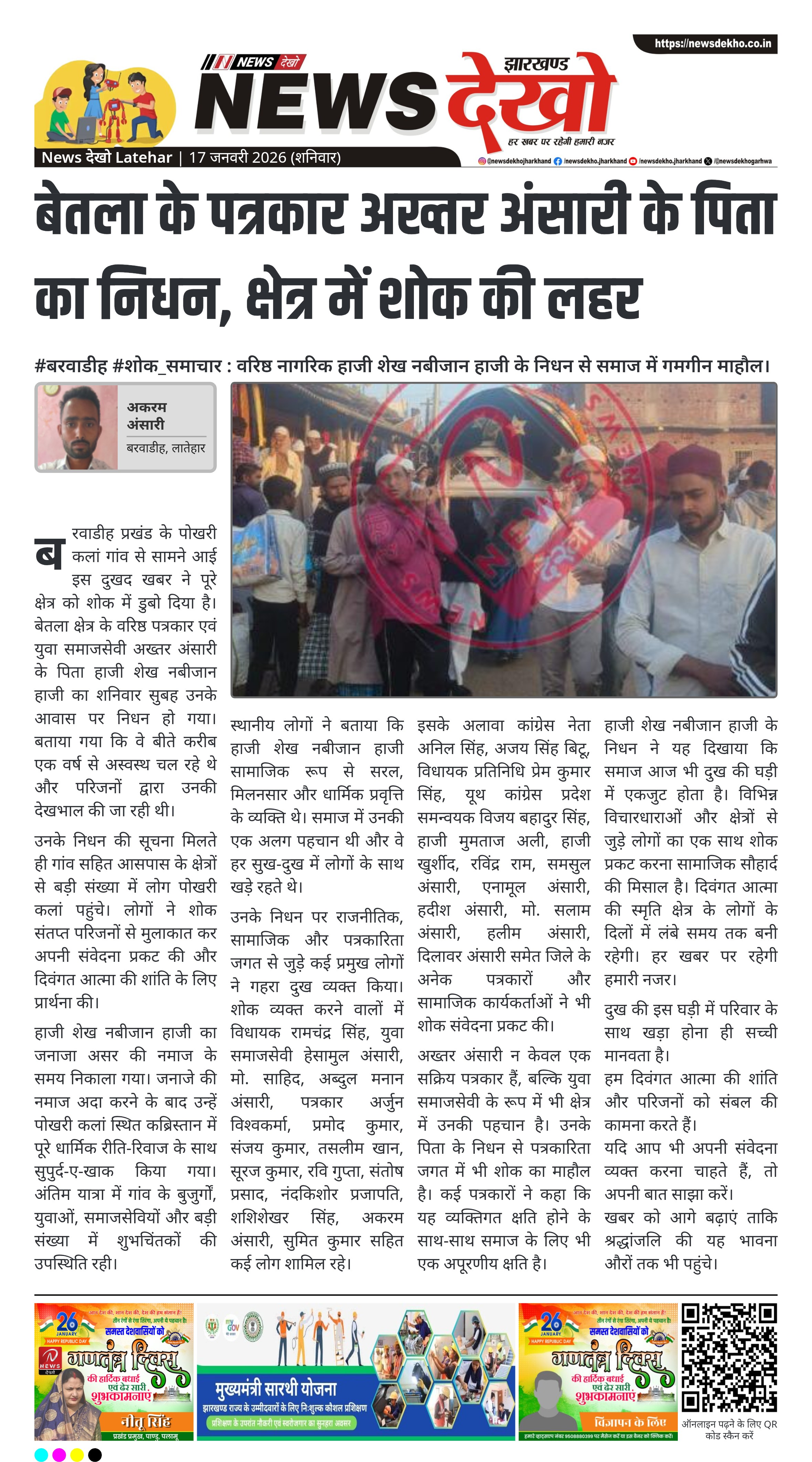 लातेहार जिले के बरवाडीह प्रखंड अंतर्गत पोखरी कलां निवासी और बेतला के दैनिक जागरण पत्रकार अख्तर अंसारी के पिता हाजी शेख नबीजान हाजी का शनिवार सुबह निधन हो गया। 85 वर्षीय हाजी शेख नबीजान हाजी लंबे समय से बीमार चल रहे थे और अपने आवास पर ही उन्होंने अंतिम सांस ली। उनके निधन की सूचना मिलते ही इलाके में शोक की लहर फैल गई। सामाजिक, राजनीतिक और पत्रकारिता जगत से जुड़े लोगों ने उनके आवास पहुंचकर परिजनों को सांत्वना दी।