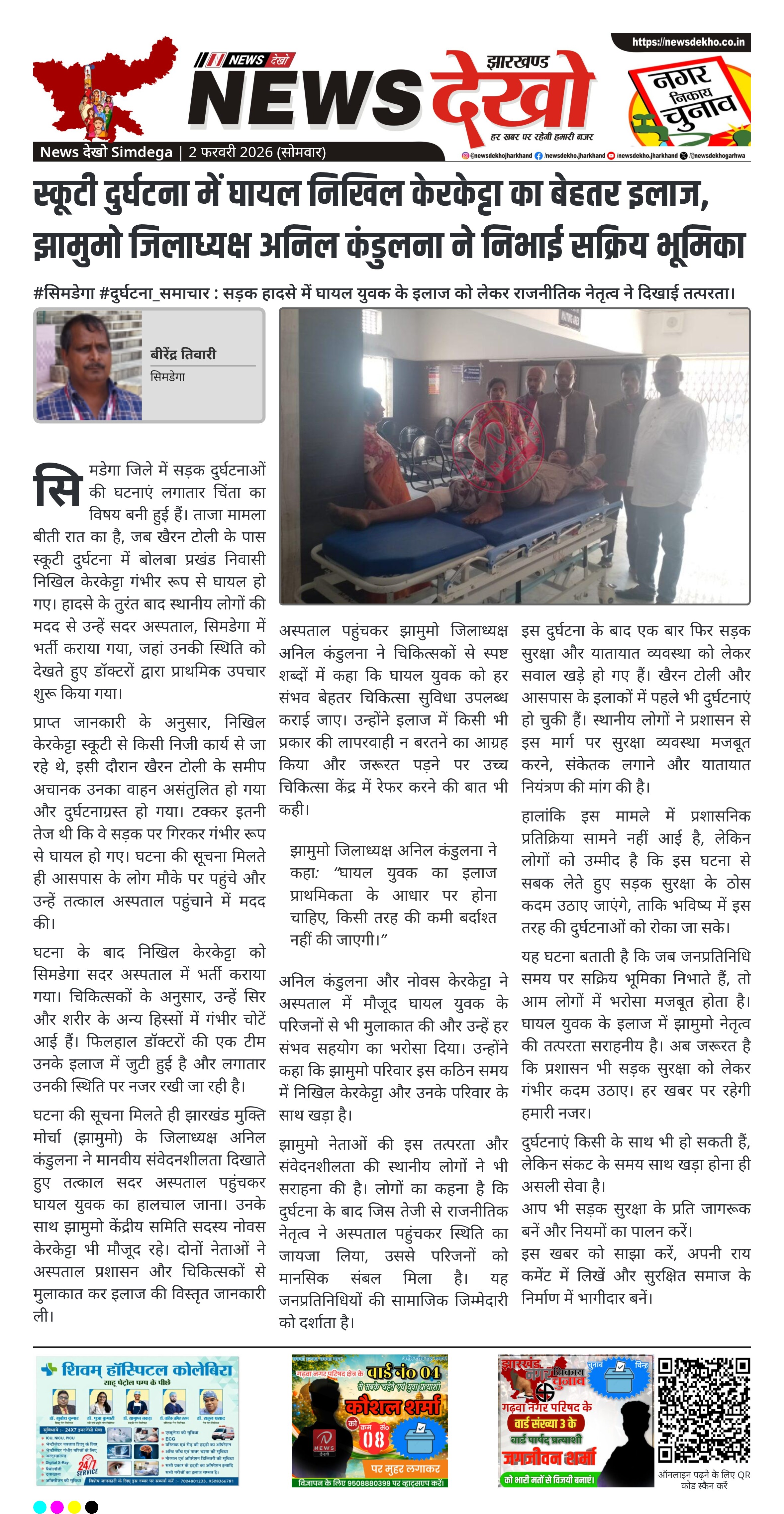 सिमडेगा जिले में स्कूटी दुर्घटना में गंभीर रूप से घायल निखिल केरकेट्टा के बेहतर इलाज के लिए झामुमो जिलाध्यक्ष अनिल कंडुलना ने सक्रिय पहल की है। हादसे के बाद घायल युवक को सदर अस्पताल में भर्ती कराया गया। सूचना मिलते ही झामुमो नेताओं ने अस्पताल पहुंचकर इलाज की स्थिति की समीक्षा की। यह घटना जनप्रतिनिधियों की मानवीय संवेदनशीलता को दर्शाती है।