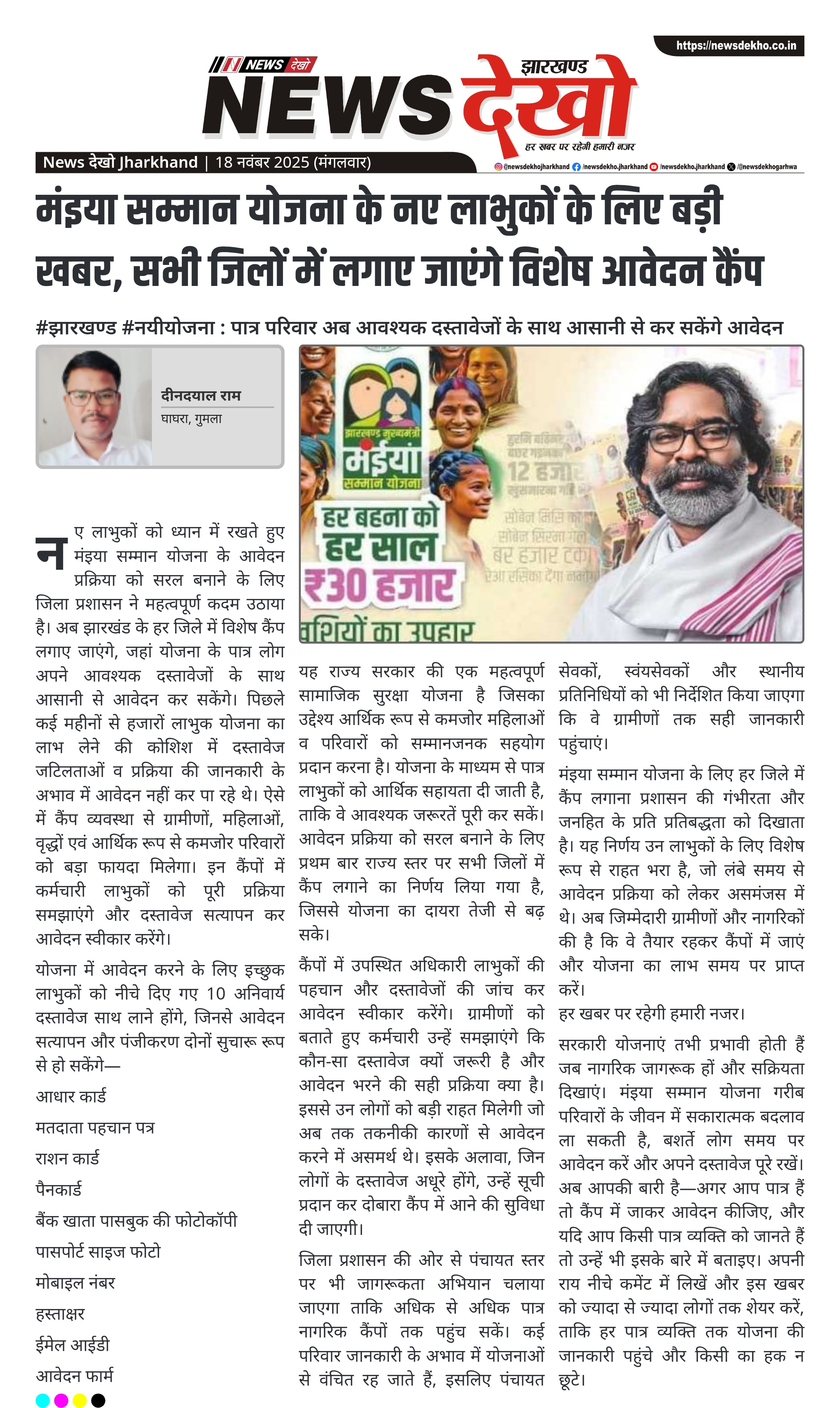नए लाभुकों को ध्यान में रखते हुए मंइया सम्मान योजना के आवेदन प्रक्रिया को सरल बनाने के लिए जिला प्रशासन ने महत्वपूर्ण कदम उठाया है। अब झारखंड के हर जिले में विशेष कैंप लगाए जाएंगे, जहां योजना के पात्र लोग अपने आवश्यक दस्तावेजों के साथ आसानी से आवेदन कर सकेंगे। पिछले कई महीनों से हजारों लाभुक योजना का लाभ लेने की कोशिश में दस्तावेज जटिलताओं व प्रक्रिया की जानकारी के अभाव में आवेदन नहीं कर पा रहे थे। ऐसे में कैंप व्यवस्था से ग्रामीणों, महिलाओं, वृद्धों एवं आर्थिक रूप से कमजोर परिवारों को बड़ा फायदा मिलेगा। इन कैंपों में कर्मचारी लाभुकों को पूरी प्रक्रिया समझाएंगे और दस्तावेज सत्यापन कर आवेदन स्वीकार करेंगे।