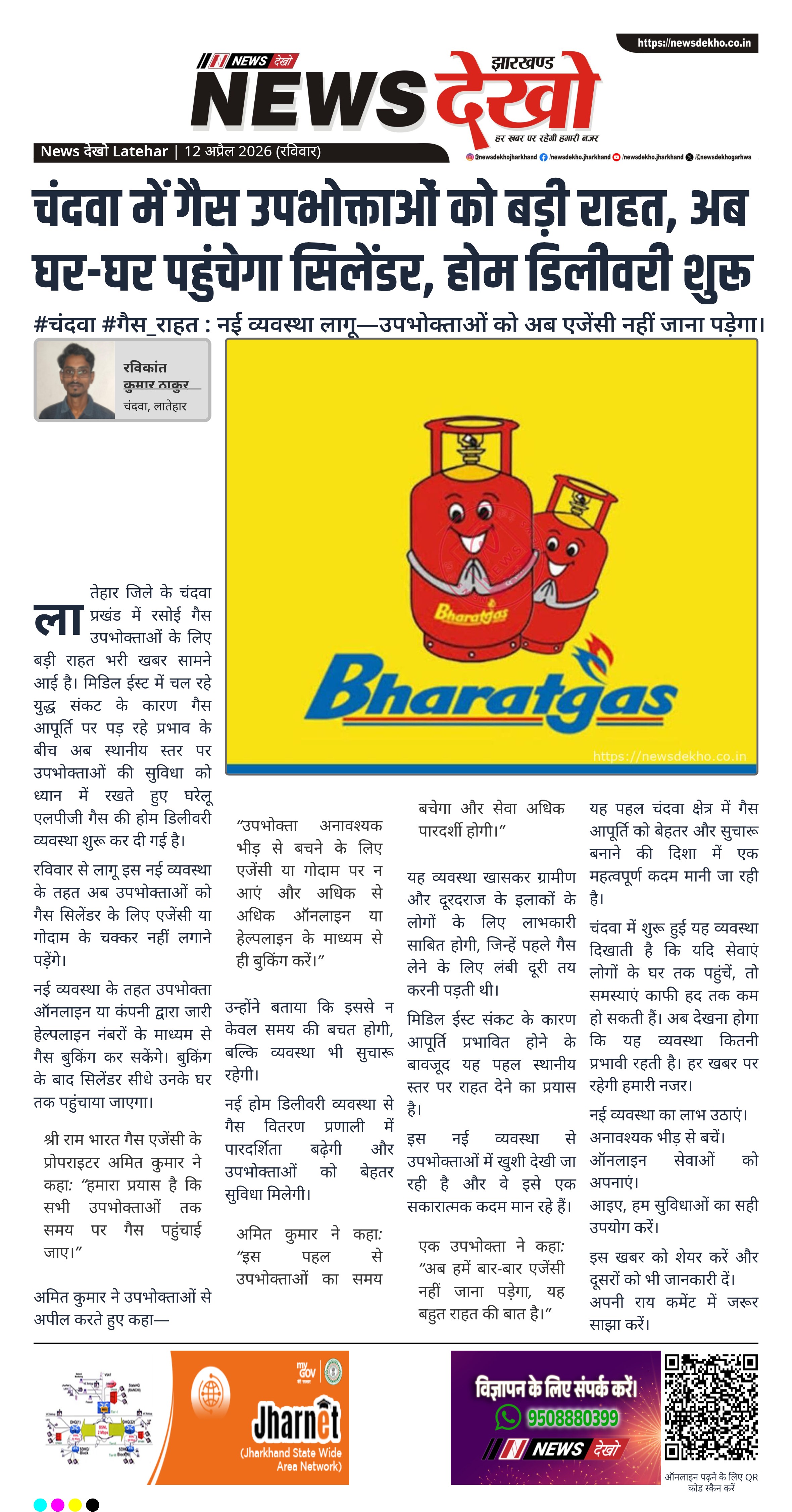 लातेहार जिले के चंदवा प्रखंड में रसोई गैस उपभोक्ताओं के लिए बड़ी राहत भरी खबर सामने आई है। मिडिल ईस्ट में चल रहे युद्ध संकट के कारण गैस आपूर्ति पर पड़ रहे प्रभाव के बीच अब स्थानीय स्तर पर उपभोक्ताओं की सुविधा को ध्यान में रखते हुए घरेलू एलपीजी गैस की होम डिलीवरी व्यवस्था शुरू कर दी गई है।