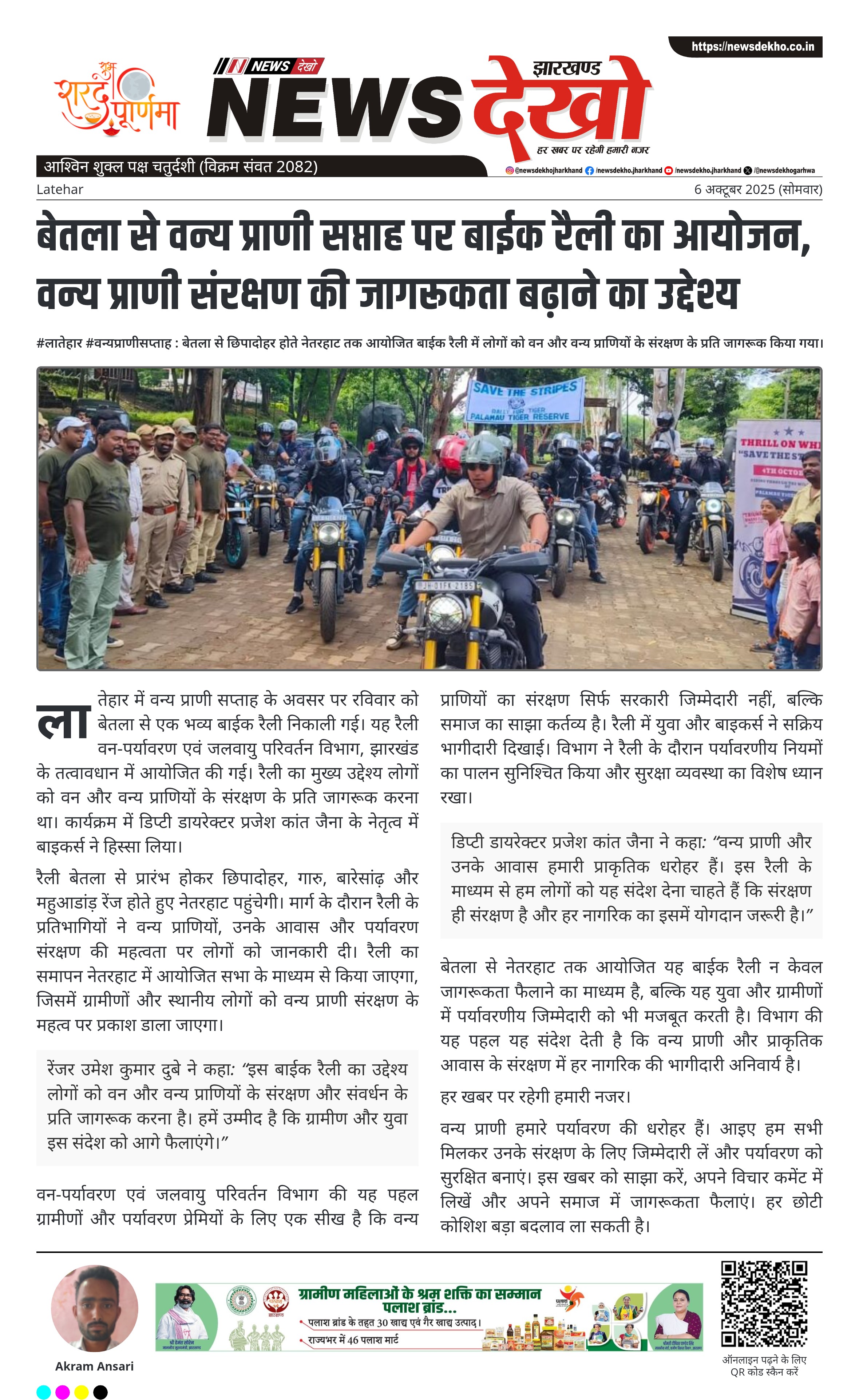 बेतला से नेतरहाट तक आयोजित यह बाईक रैली न केवल जागरूकता फैलाने का माध्यम है, बल्कि यह युवा और ग्रामीणों में पर्यावरणीय जिम्मेदारी को भी मजबूत करती है। विभाग की यह पहल यह संदेश देती है कि वन्य प्राणी और प्राकृतिक आवास के संरक्षण में हर नागरिक की भागीदारी अनिवार्य है।