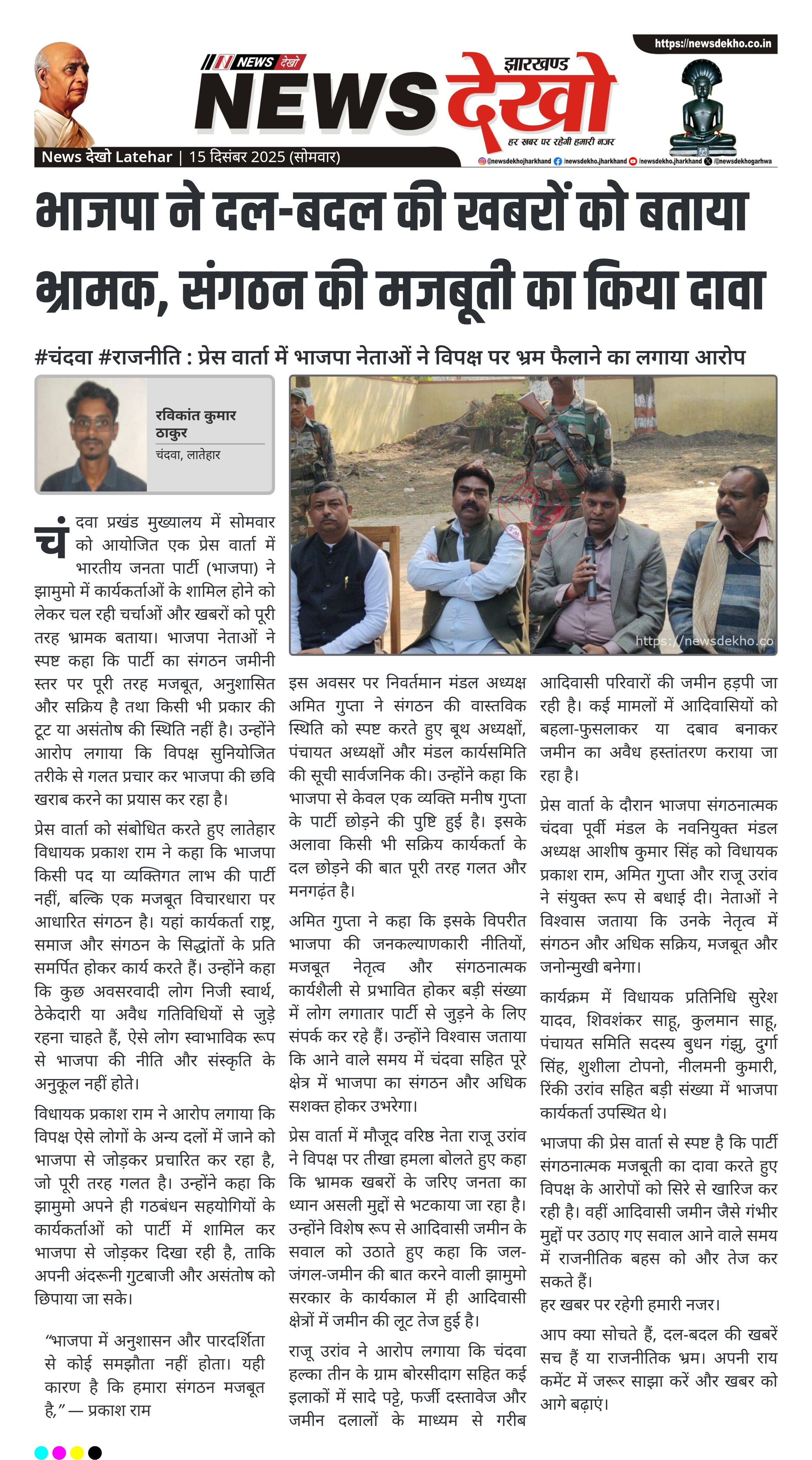 भाजपा की प्रेस वार्ता से स्पष्ट है कि पार्टी संगठनात्मक मजबूती का दावा करते हुए विपक्ष के आरोपों को सिरे से खारिज कर रही है। वहीं आदिवासी जमीन जैसे गंभीर मुद्दों पर उठाए गए सवाल आने वाले समय में राजनीतिक बहस को और तेज कर सकते हैं।