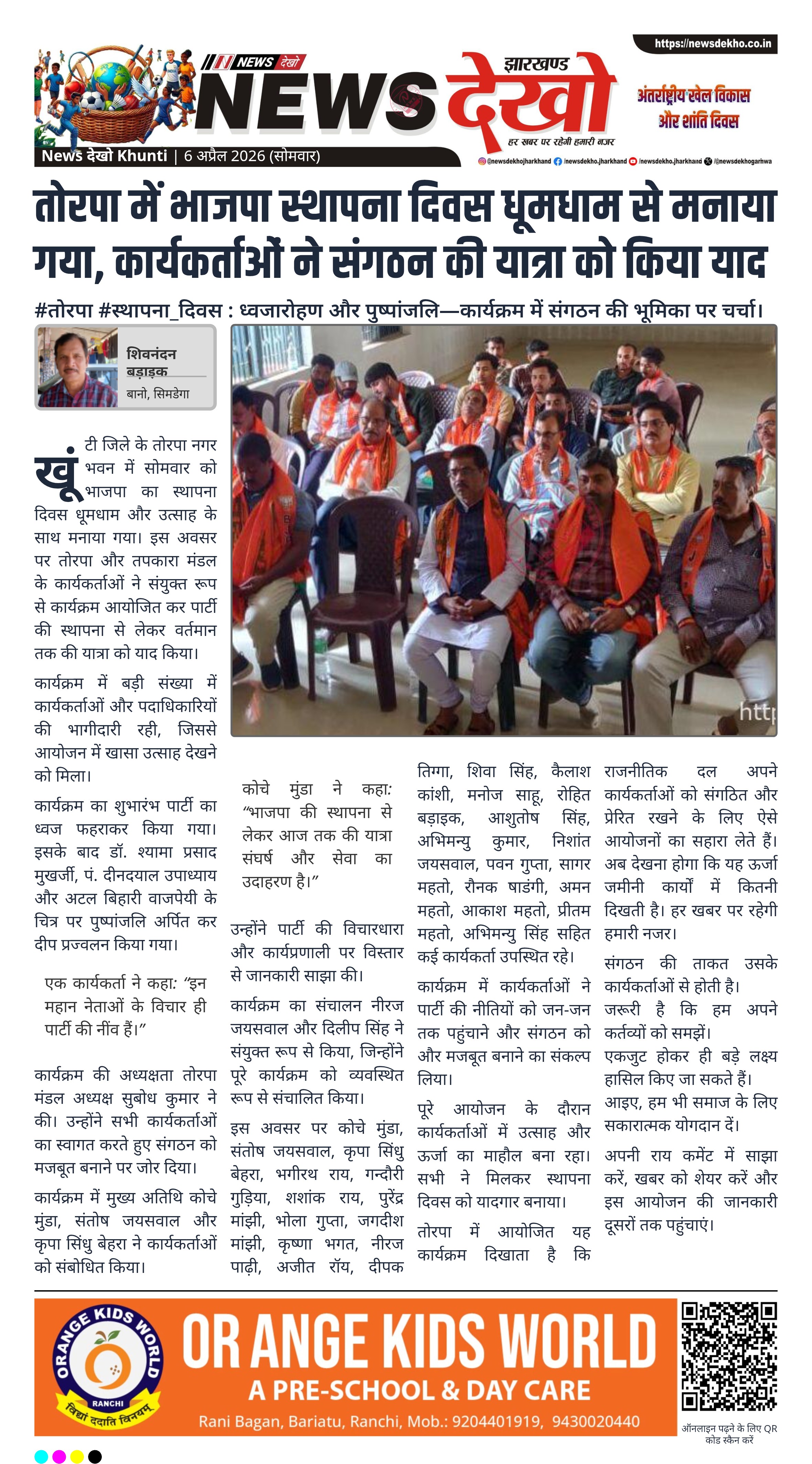 - 06 अप्रैल 2026 को तोरपा में स्थापना दिवस मनाया गया।