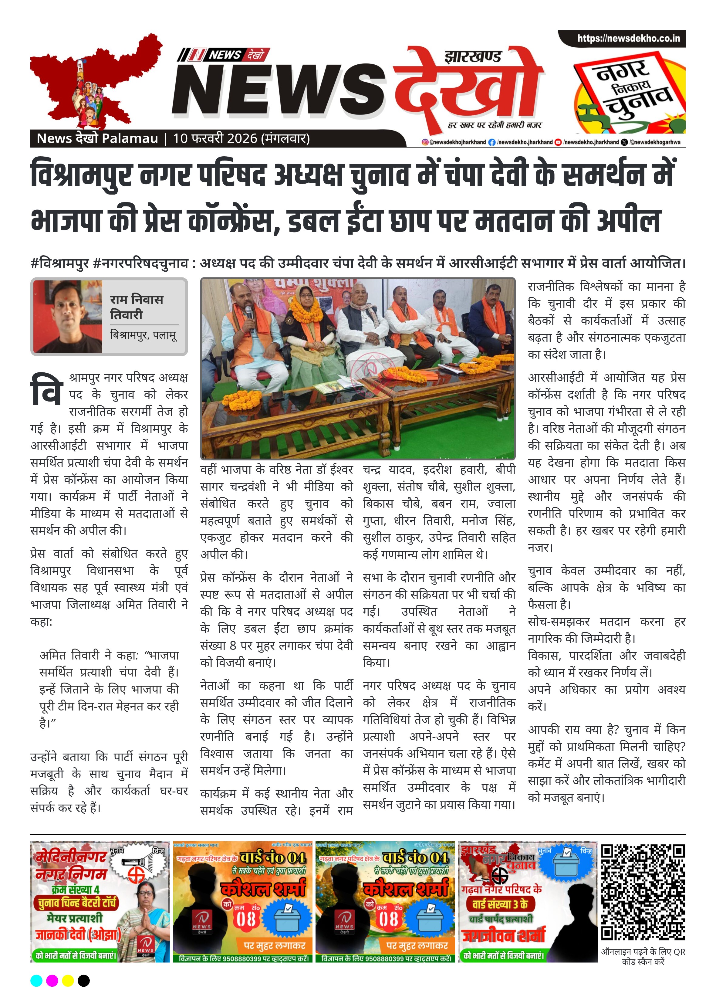 पलामू जिले के विश्रामपुर में नगर परिषद अध्यक्ष पद की उम्मीदवार चंपा देवी के समर्थन में आरसीआईटी सभागार में प्रेस कॉन्फ्रेंस आयोजित की गई। भाजपा नेताओं ने डबल ईंटा छाप क्रमांक संख्या 8 पर मतदान की अपील की। पूर्व विधायक सह पूर्व स्वास्थ्य मंत्री अमित तिवारी समेत कई वरिष्ठ नेताओं ने मीडिया को संबोधित किया। चुनावी माहौल के बीच यह बैठक रणनीतिक रूप से महत्वपूर्ण मानी जा रही है।