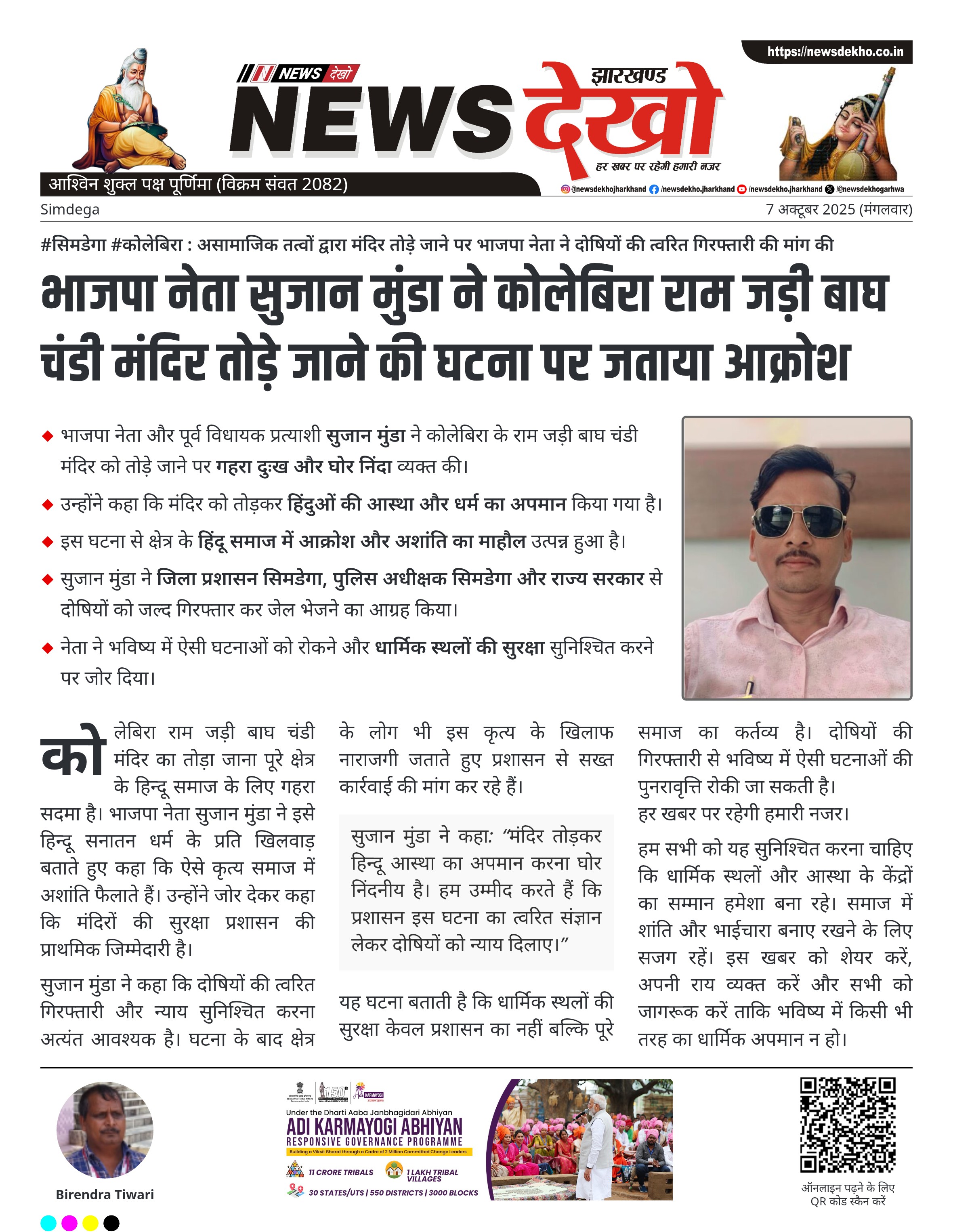 • भाजपा नेता और पूर्व विधायक प्रत्याशी सुजान मुंडा ने कोलेबिरा के राम जड़ी बाघ चंडी मंदिर को तोड़े जाने पर गहरा दुःख और घोर निंदा व्यक्त की।